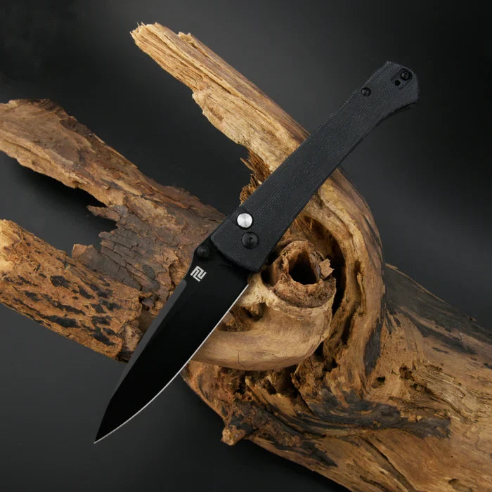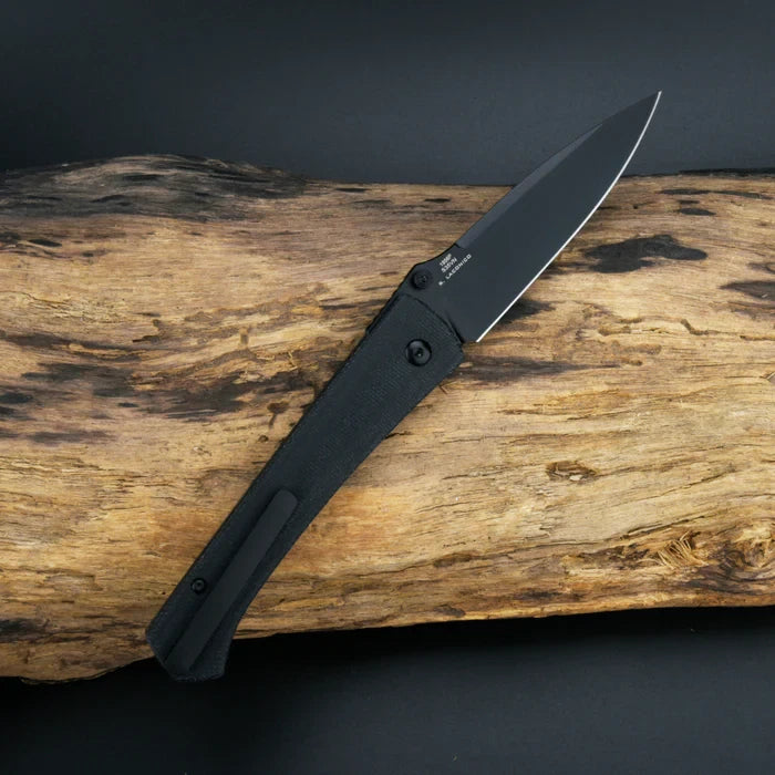 4.5" (11.43cm) closed. 3.5" (8.89cm) black finish S35VN stainless drop point blade. Black micarta handle. Thumb stud. Pocket clip. Boxed.