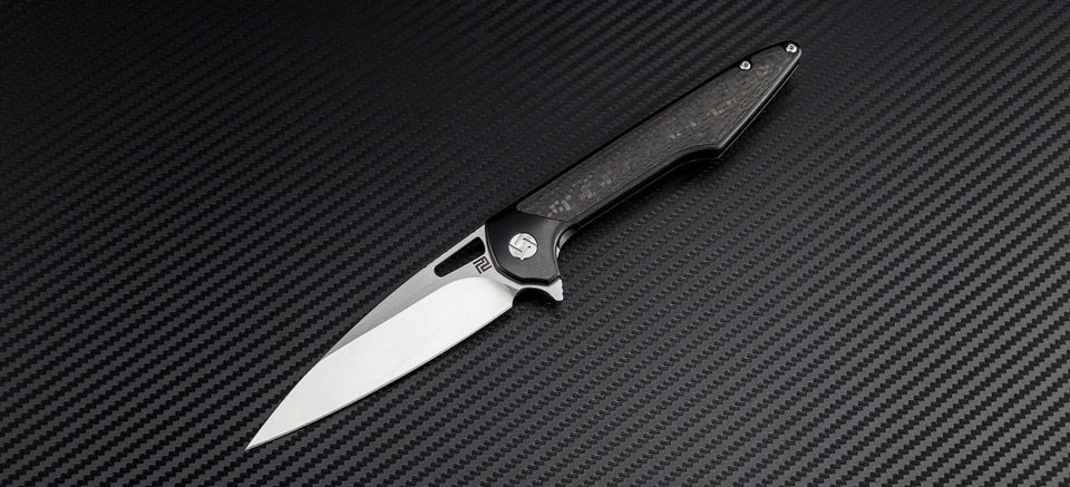 5" closed. 3.75" satin finish Bohler M390 stainless blade. Black titanium handle with carbon fiber inlay. Extended tang. Thumb pull. Pocket clip. Designed by Dylan Mallery. Boxed.