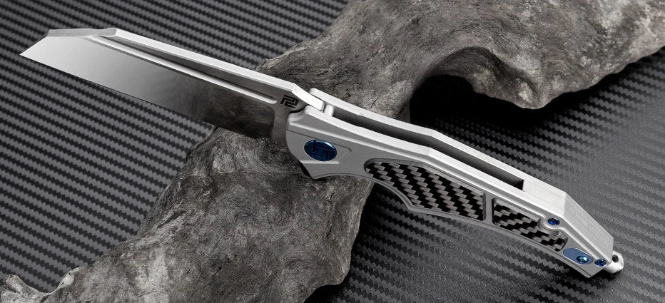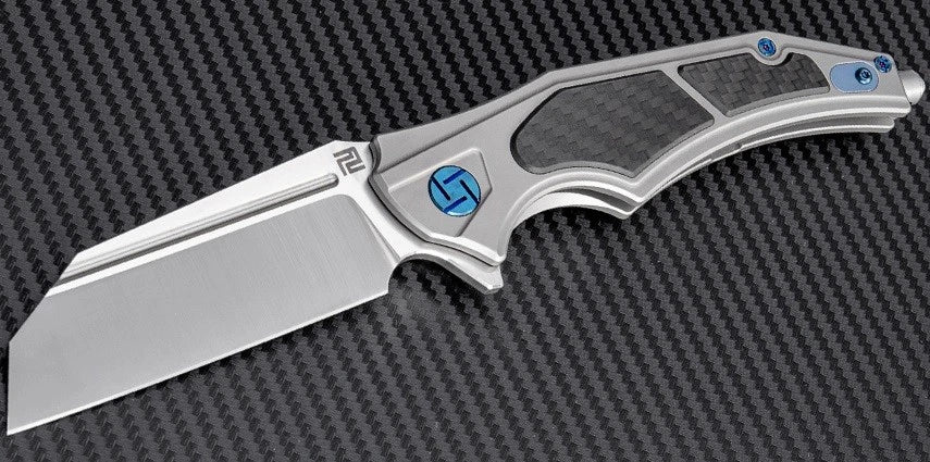 5.5" closed. 3.5" satin finish Bohler M390 stainless tanto blade. Gray titanium handle with carbon fiber inlay. Extended tang. Glass breaker. Lanyard hole. Pocket clip. Boxed.