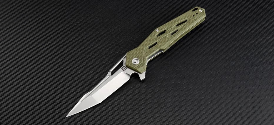 5" closed. 3.75" stonewash finish D2 tool steel blade. Green textured G10 handle. Extended tang. Thumb pull. Pocket clip. Lanyard hole. Boxed.