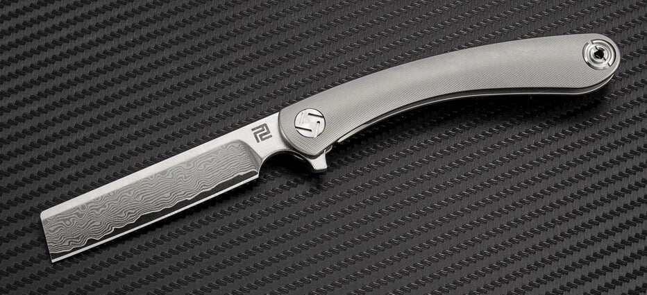 5" closed. 3.5" Damascus steel blade. Gray titanium handle. Extended tang. Lanyard hole. Pocket clip. Boxed.