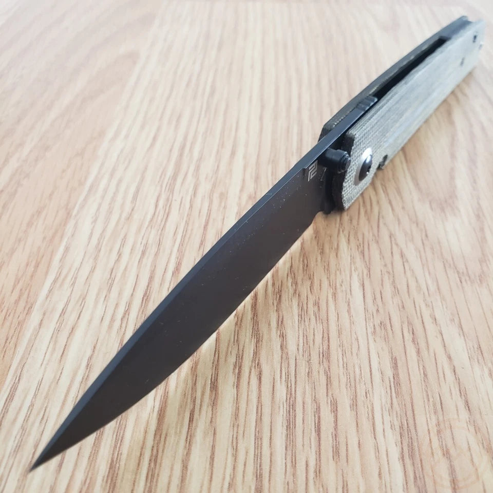 4.5" (11.43cm) closed. 3.5" (8.89cm) black PVD coated AR-RPM9 stainless blade. Green canvas micarta handle. Thumb stud. Extended tang. Pocket clip. Boxed.