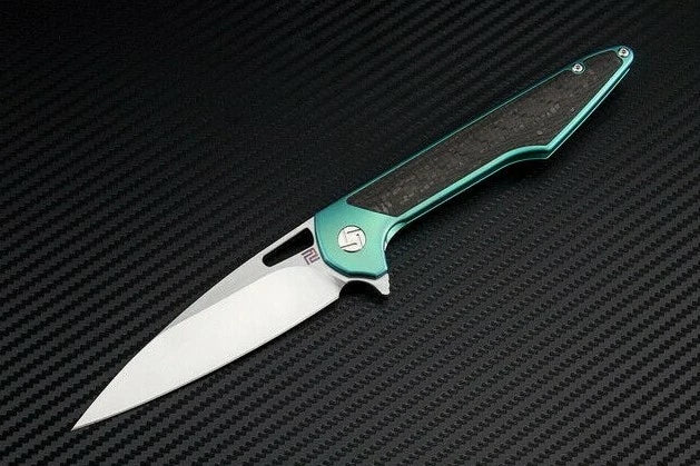4" closed. 3" satin finish Bohler M390 stainless blade. Green titanium handle with carbon fiber inlay. Extended tang. Thumb pull. Pocket clip. Designed by Dylan Mallery. Boxed.