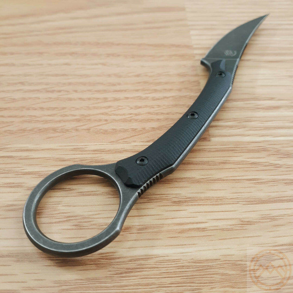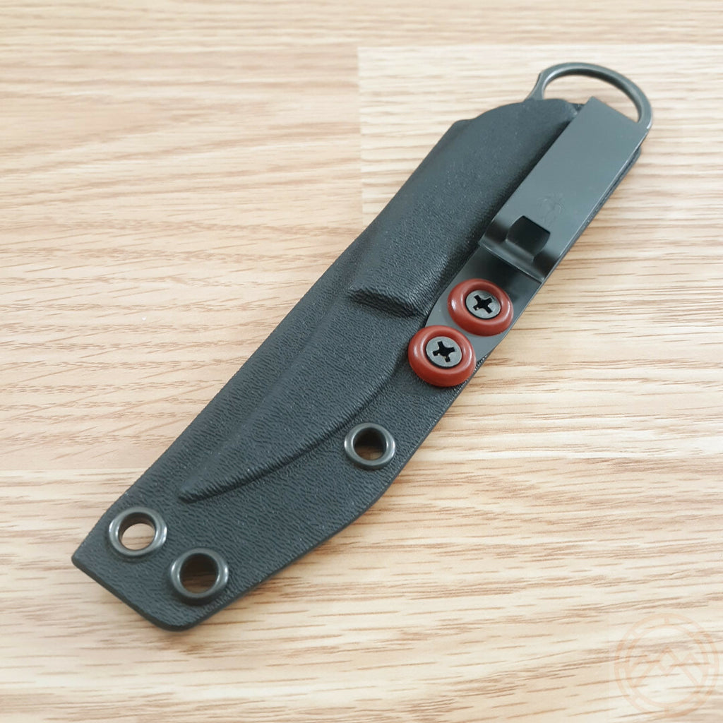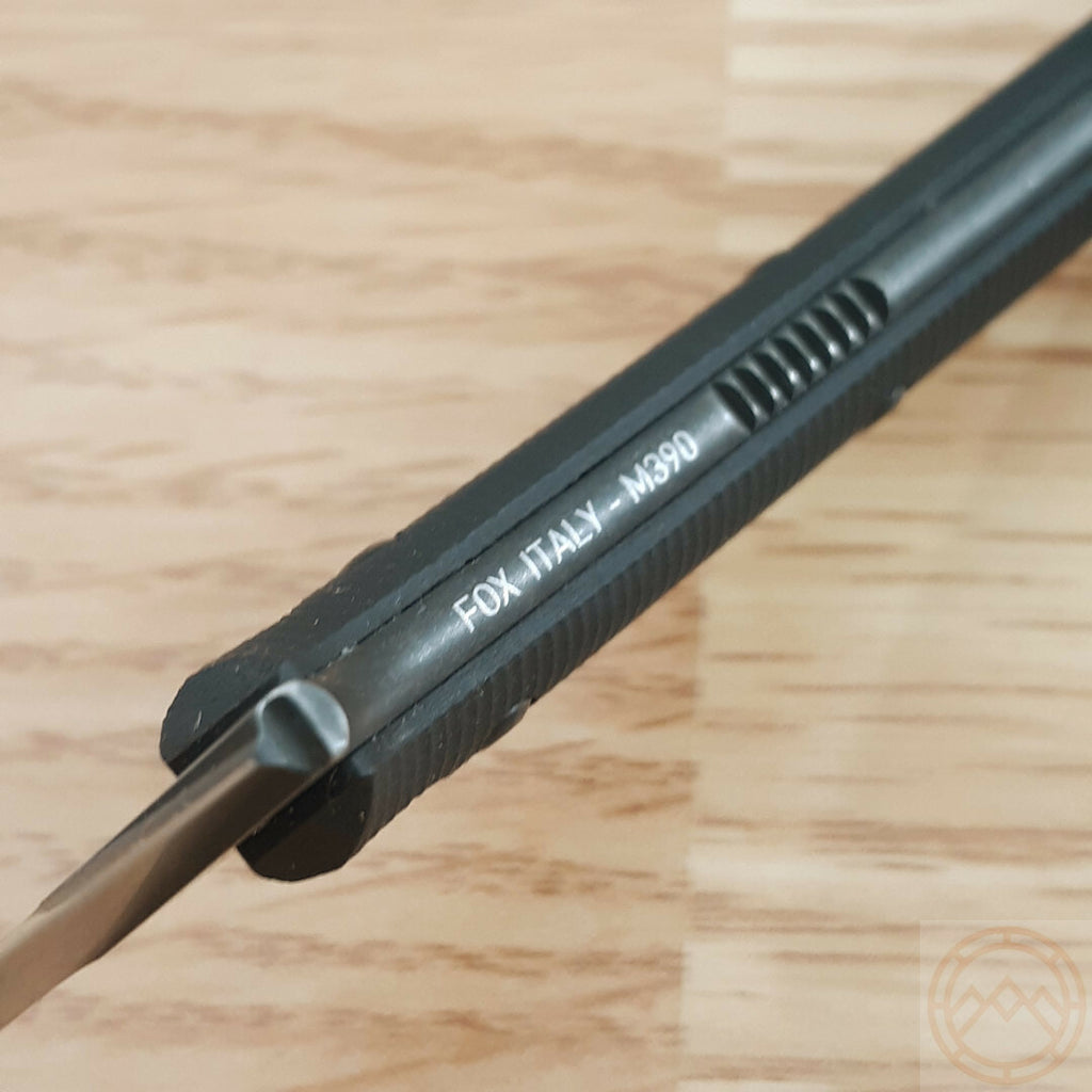 Dark stonewash M390 plain edge blade. 3D black G10 handle. Kydex sheath and discreet carry concept clip.