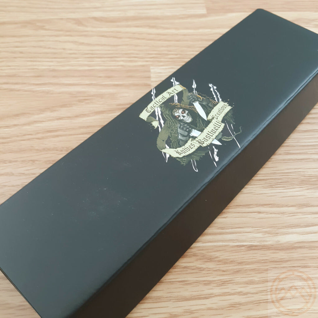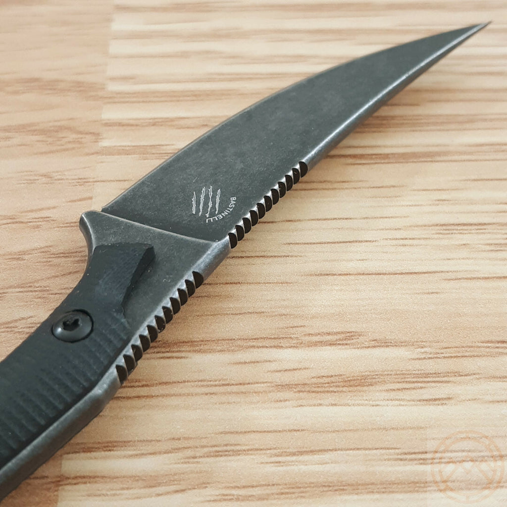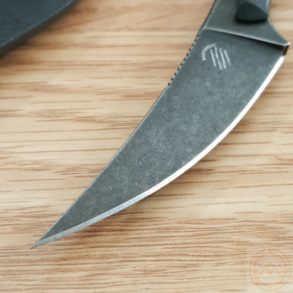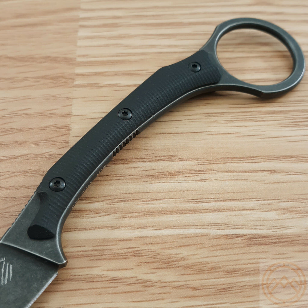 Dark stonewash M390 plain edge blade. 3D black G10 handle. Kydex sheath and discreet carry concept clip.