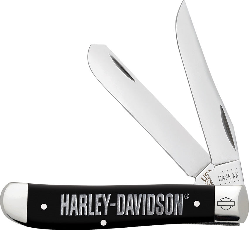 The Case Harley Davidson Black Synthetic Mini Trapper features mirror polished Tru-Sharp surgical steel clip point and spey blad