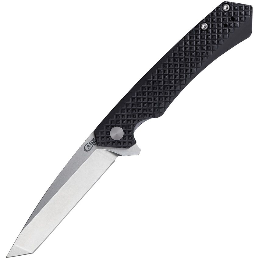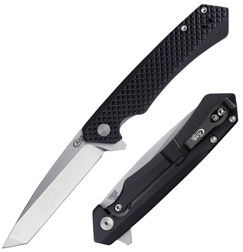 KINZUA S35VN pattern. 4.75" (12.07cm) closed. 3.75" (9.53cm) stonewash finish S35VN stainless tanto blade. Black textured aluminum handle. Extended tang. Pocket clip. Boxed.