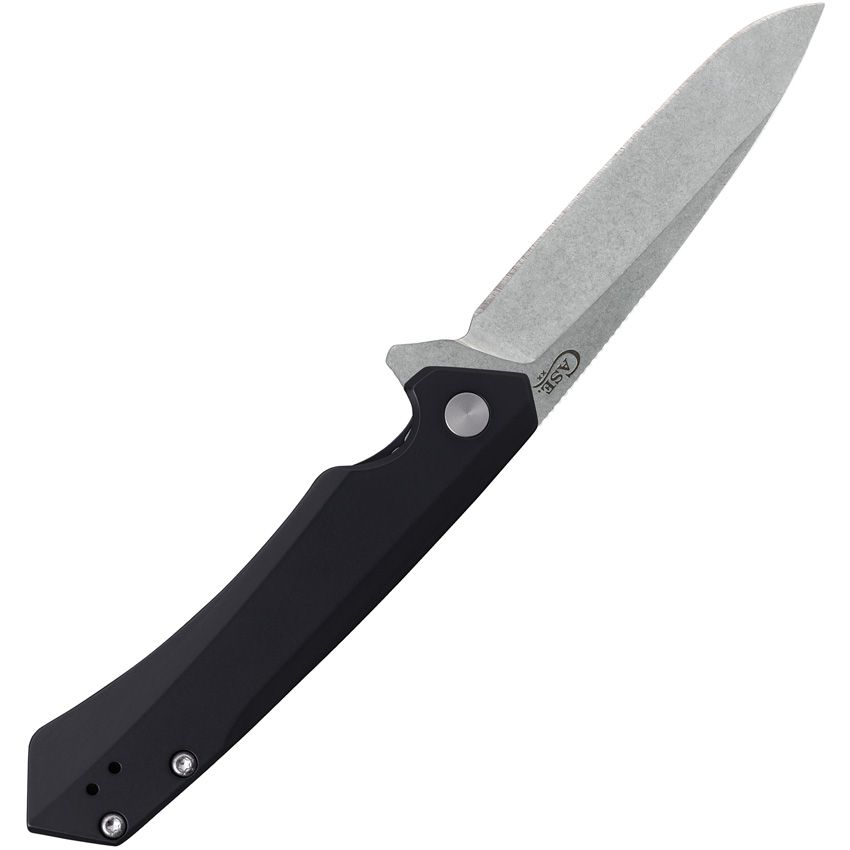 KINZUA pattern. 4.75" (12.07cm) closed. Stonewash finish S35VN stainless spear point blade. Black anodized aluminum handle. Extended tang. Pocket clip. Boxed.