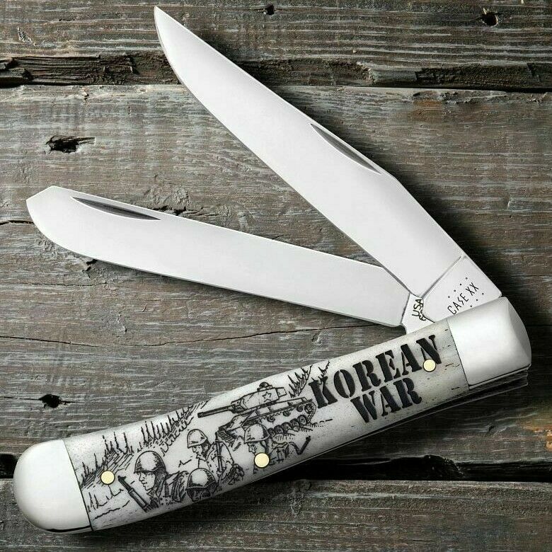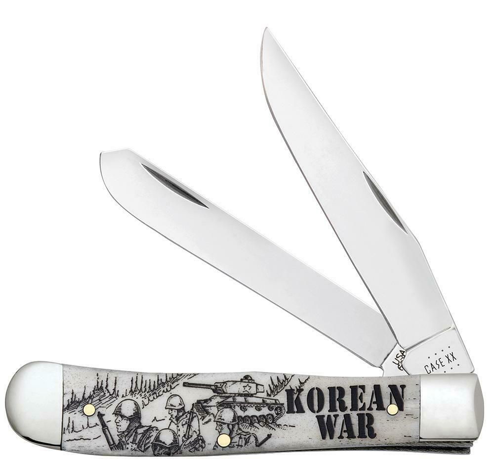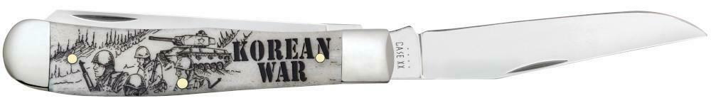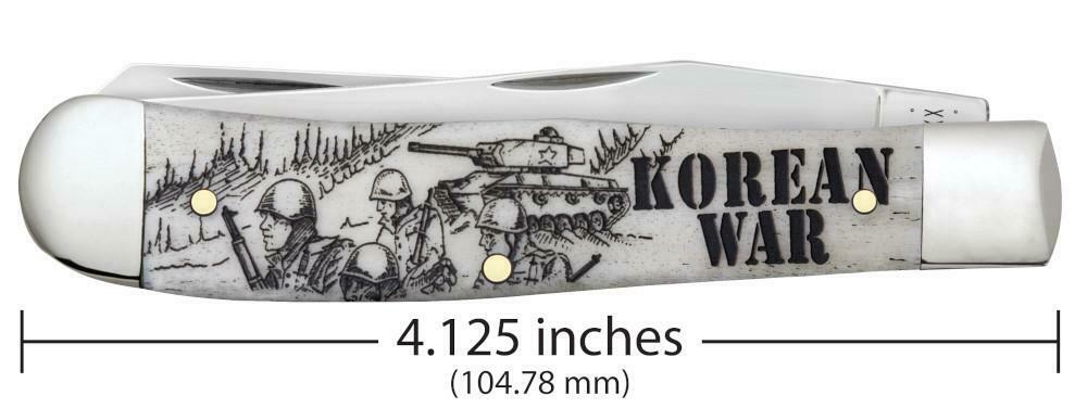 War Series. 6254 SS pattern. 4.13" (10.49cm) closed. Mirror finish stainless clip and spey blades. Natural smooth bone handle. Nickel silver bolster(s). Korean War handle embellishment. Boxed