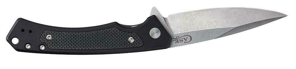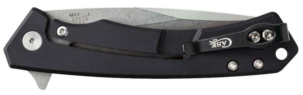 MARILLA pattern. 4.75" (12.07cm) closed. 3.75" (9.53cm) stonewash finish S35VN stainless blade. Black aluminum handle with black G10 insert. Extended tang Pocket clip. Boxed.