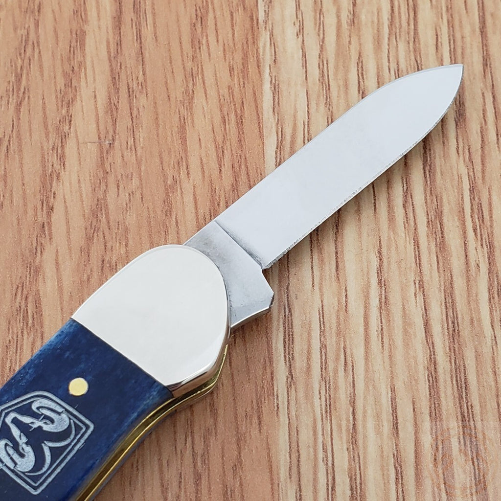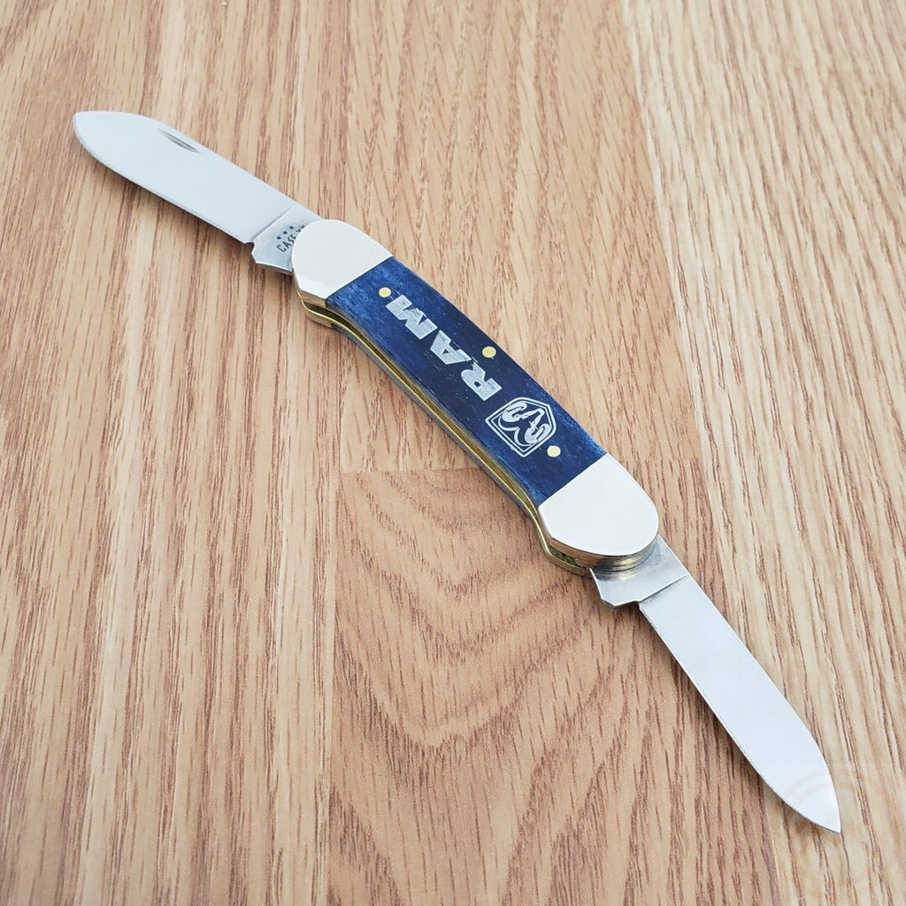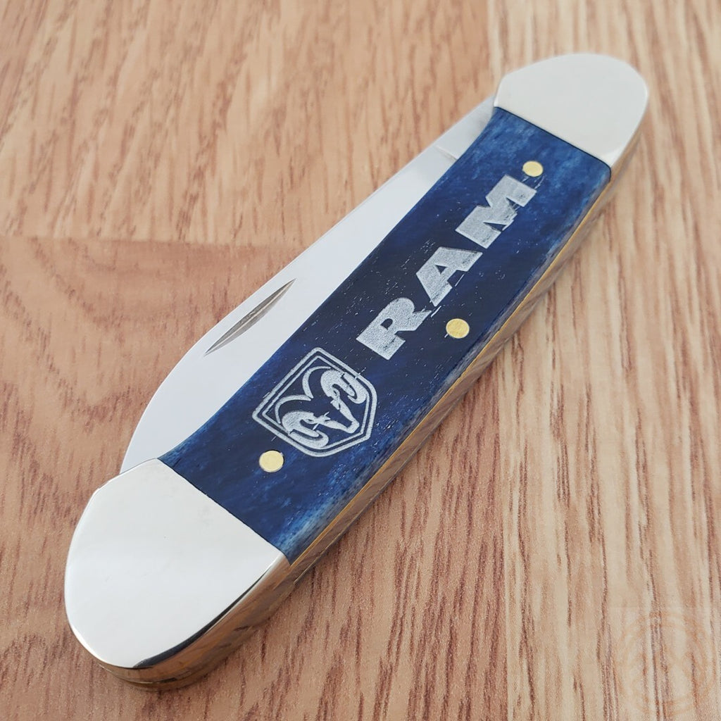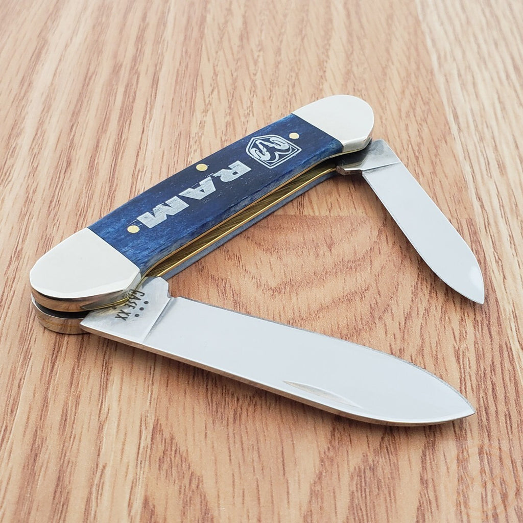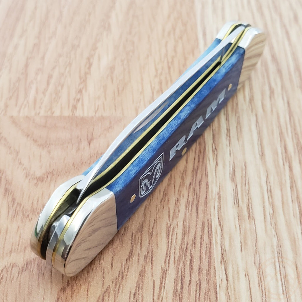 62131 SS pattern. 3.63" (9.22cm) closed. Mirror finish stainless spear and pen blades. Navy blue smooth bone handle. Nickel silver bolster(s). RAM handle artwork. Boxed.