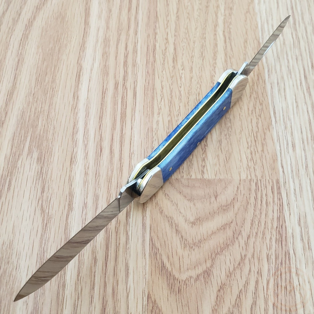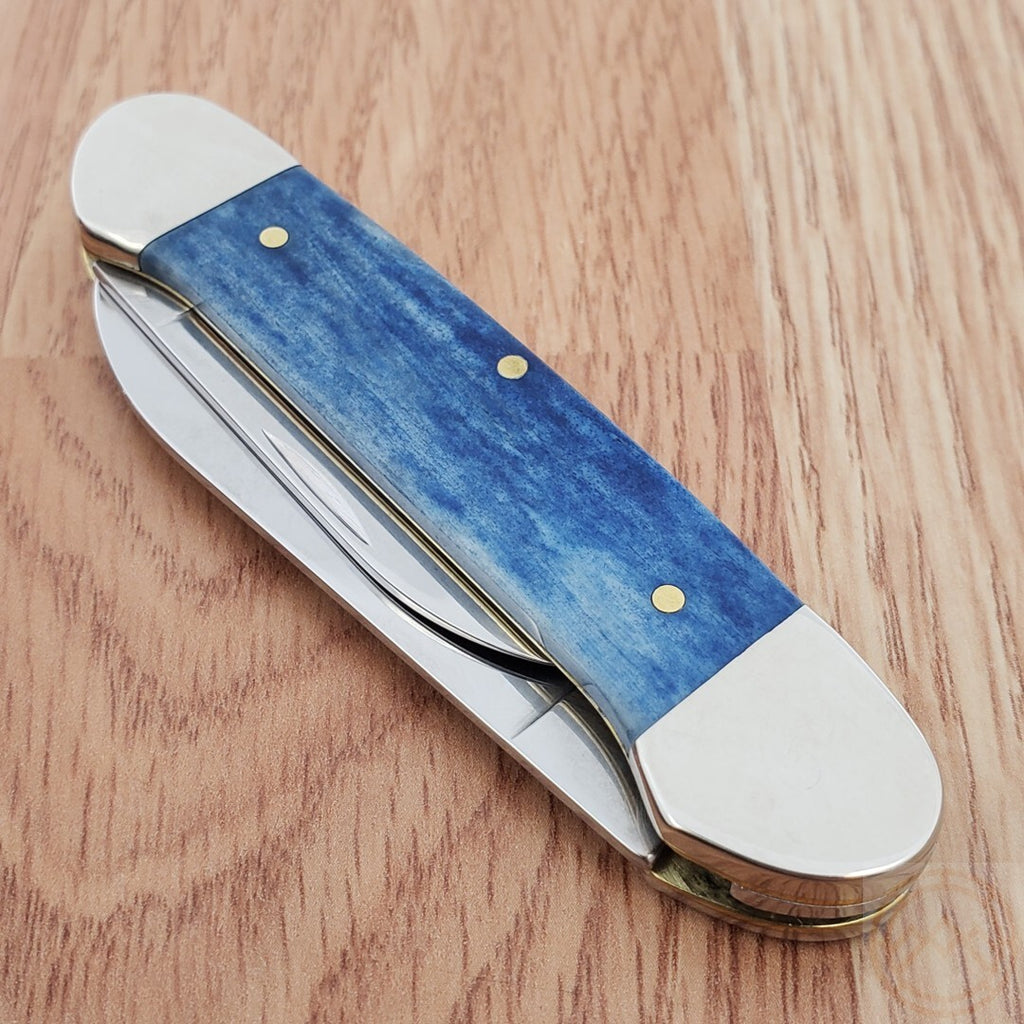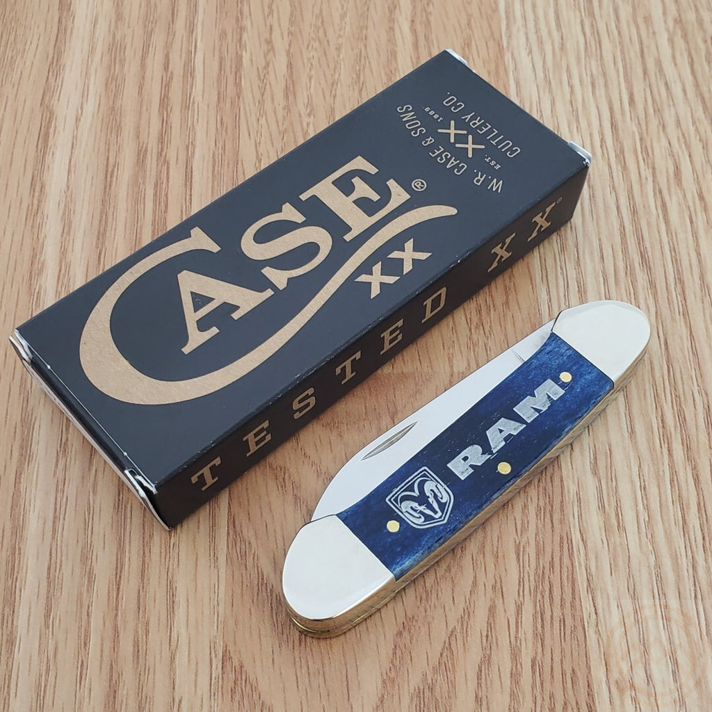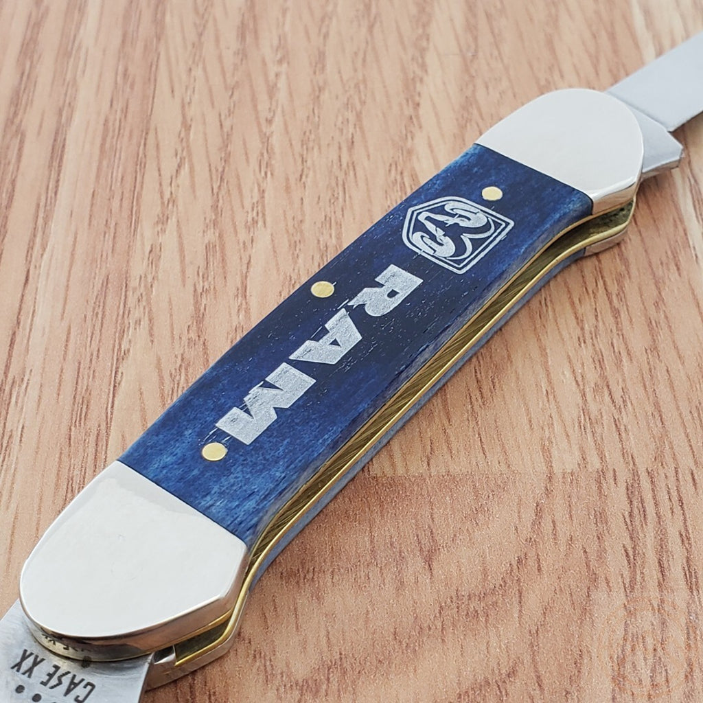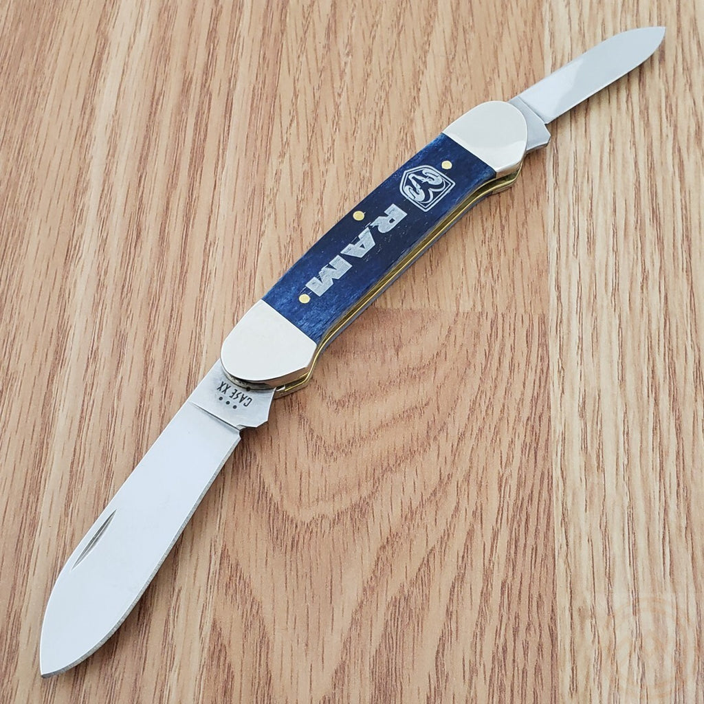 62131 SS pattern. 3.63" (9.22cm) closed. Mirror finish stainless spear and pen blades. Navy blue smooth bone handle. Nickel silver bolster(s). RAM handle artwork. Boxed.