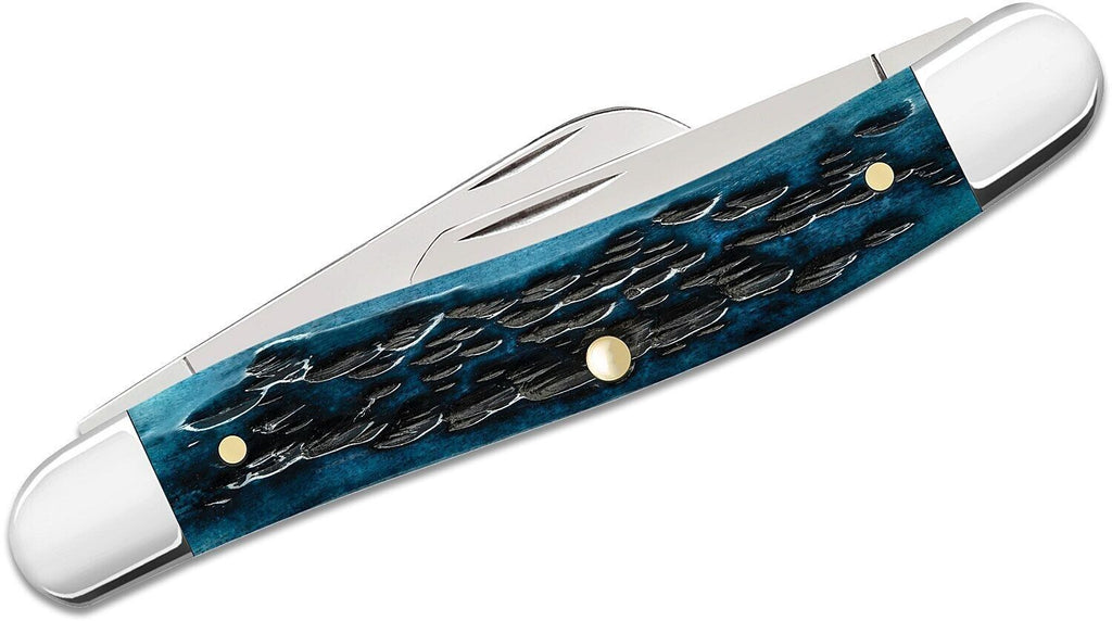 Medium Stockman 51851 (6318 SS) Closed Length: 3.63" Blade Steel: Tru-Sharp Stainless Steel Blade Shapes: Clip, Sheepsfoot, Spey Blade Finish: Mirror-Polished Handle Material: Pocket Worn Peach Seed Jig Mediterranean Blue Bone