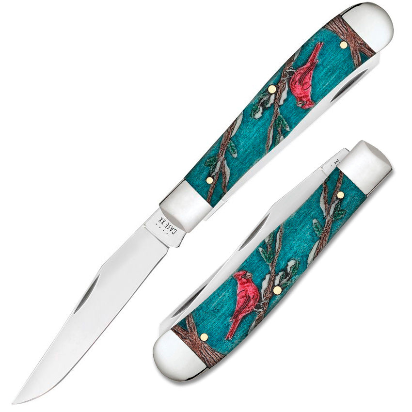 6254 SS pattern. 4.13" (10.49cm) closed. Mirror finish stainless clip and spey blades. Embellished Color Wash natural bone handle. Nickel silver bolster(s). Cardinal handle artwork. Gift boxed. The handle of this knife is made from cow bone.