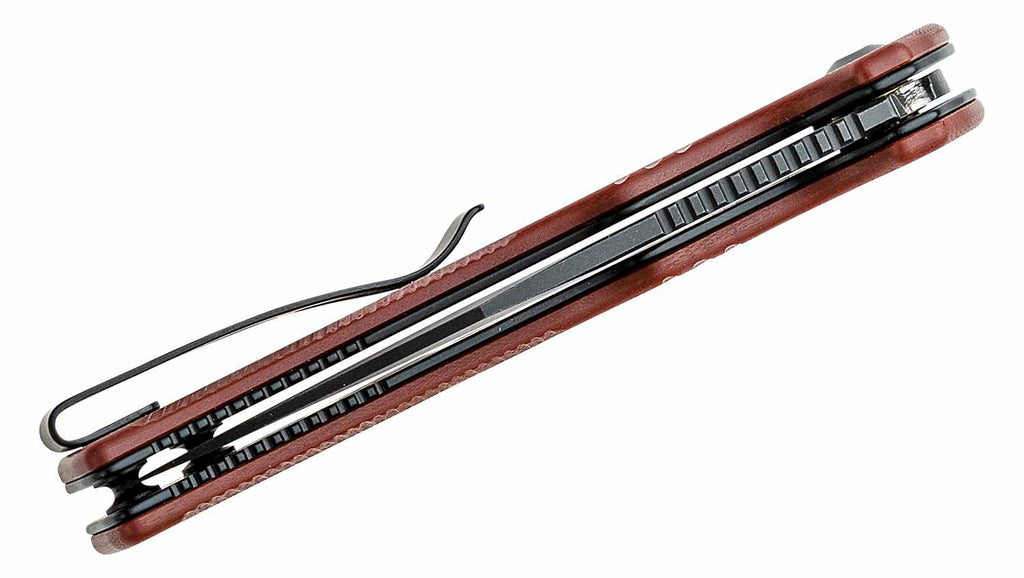 4.5" (11.43cm) closed. 3.5" (8.89cm) black stonewash finish partially serrated 14C28N Sandvik stainless blade. Burgundy G10 handle. Extended tang. Pocket clip. Black nylon zippered storage case. Boxed.