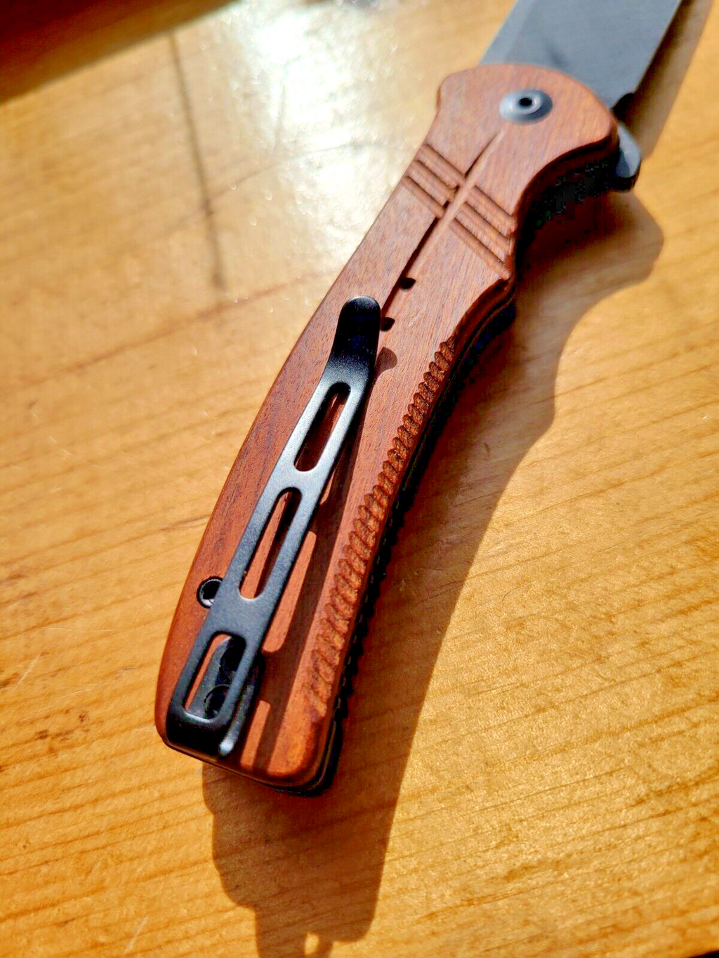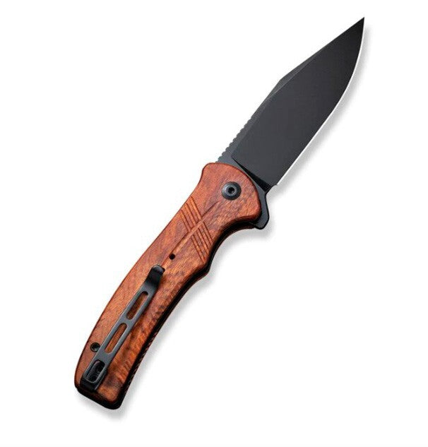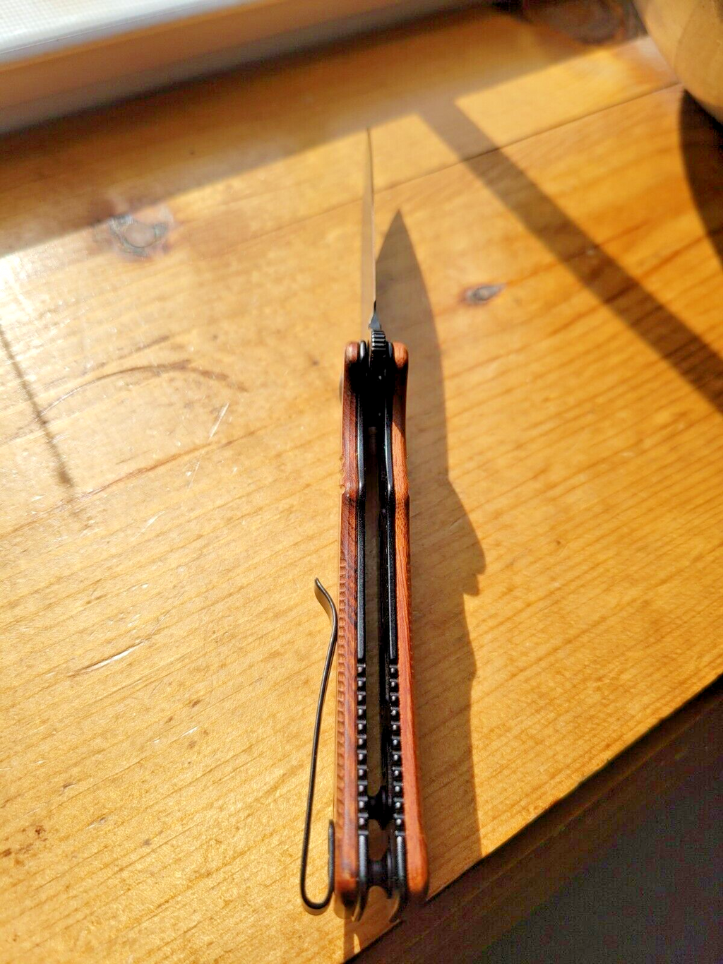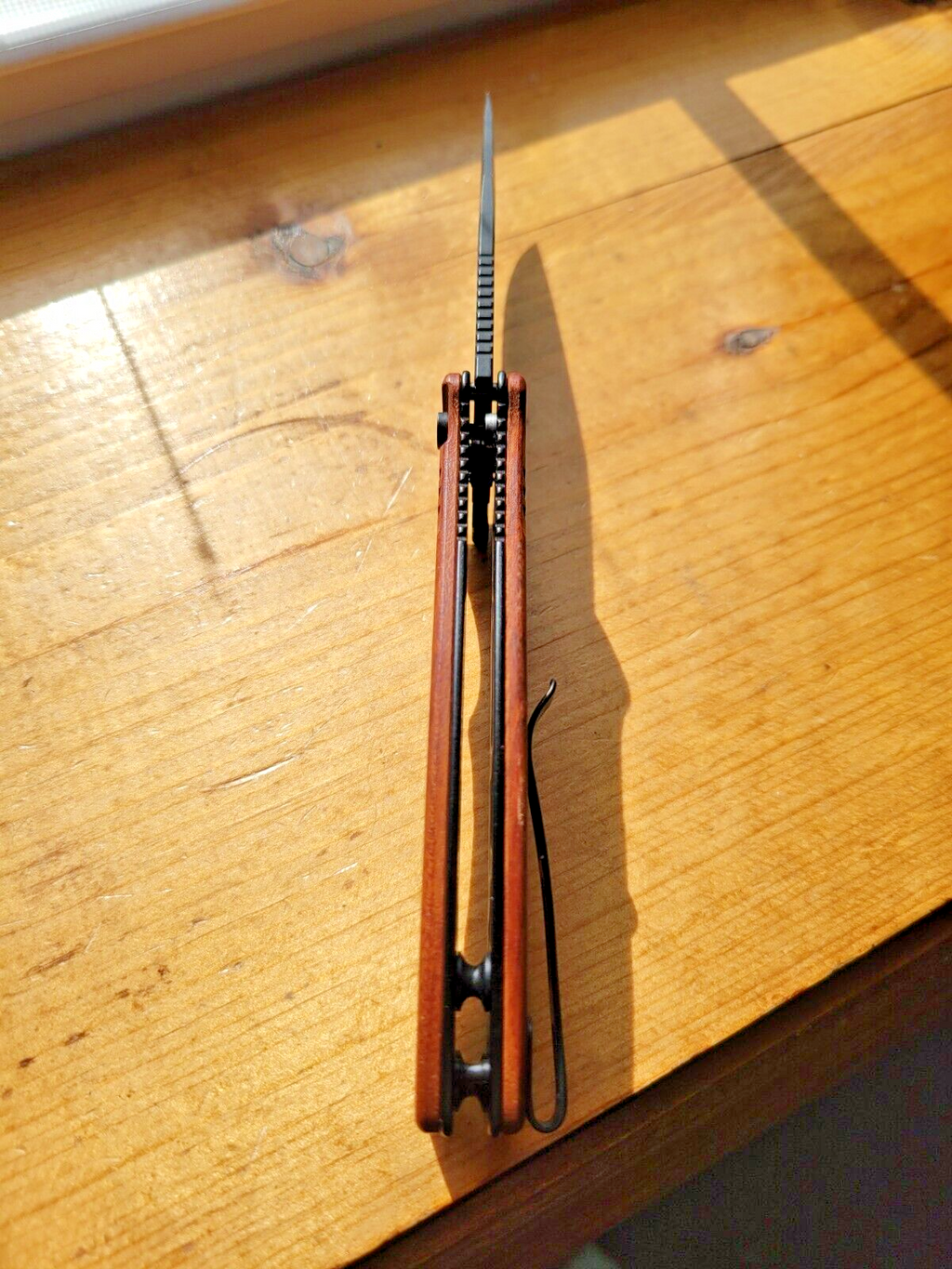 Blade Material: 14C28N Blade Hardness: 57-59HRC Blade Grind: Flat Blade Finish: Black Stonewashed Blade Type: Clip Point Handle Material: Guibourtia Wood Handle Color/Finish: Wood Liner Material: Stainless Steel Liner Color/Finish: Black Pocket Clip: Tip-Up, L/R Clip Material: Stainless Steel Screws Material: Stainless Steel Pivot Assembly: Caged Ceramic Ball Bearing Locking Mechanism: Button Lock