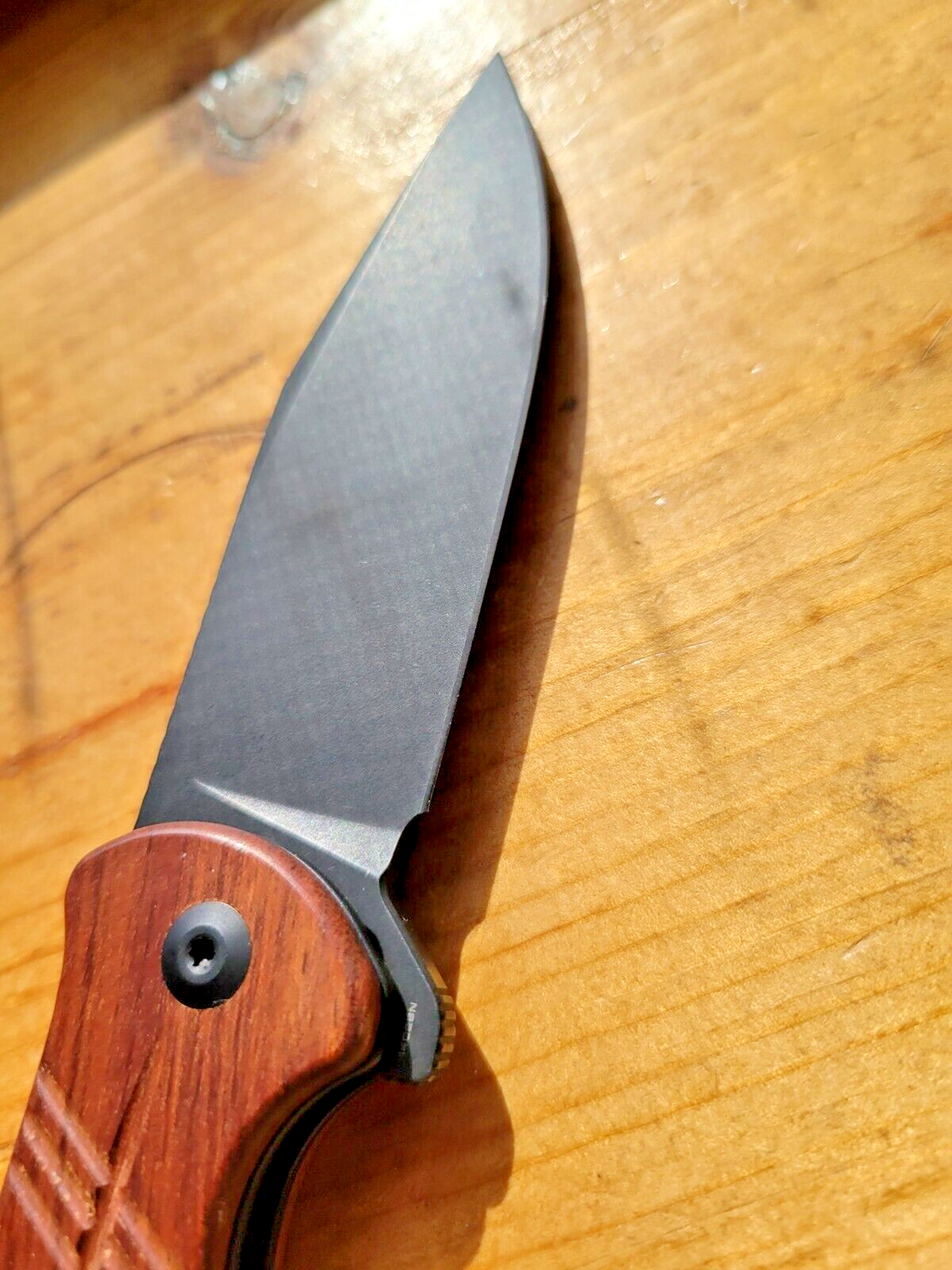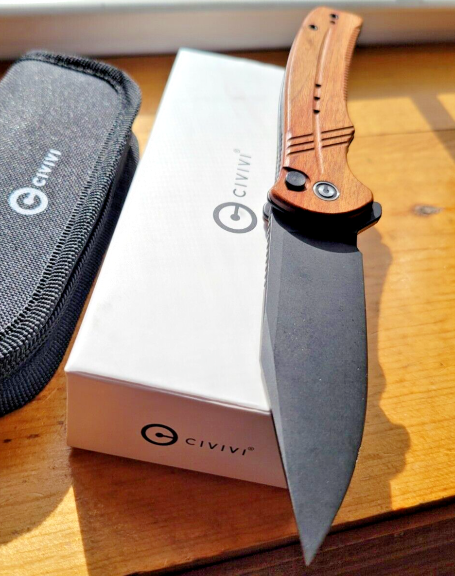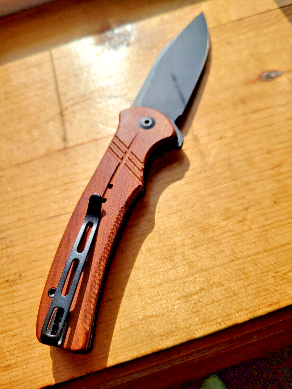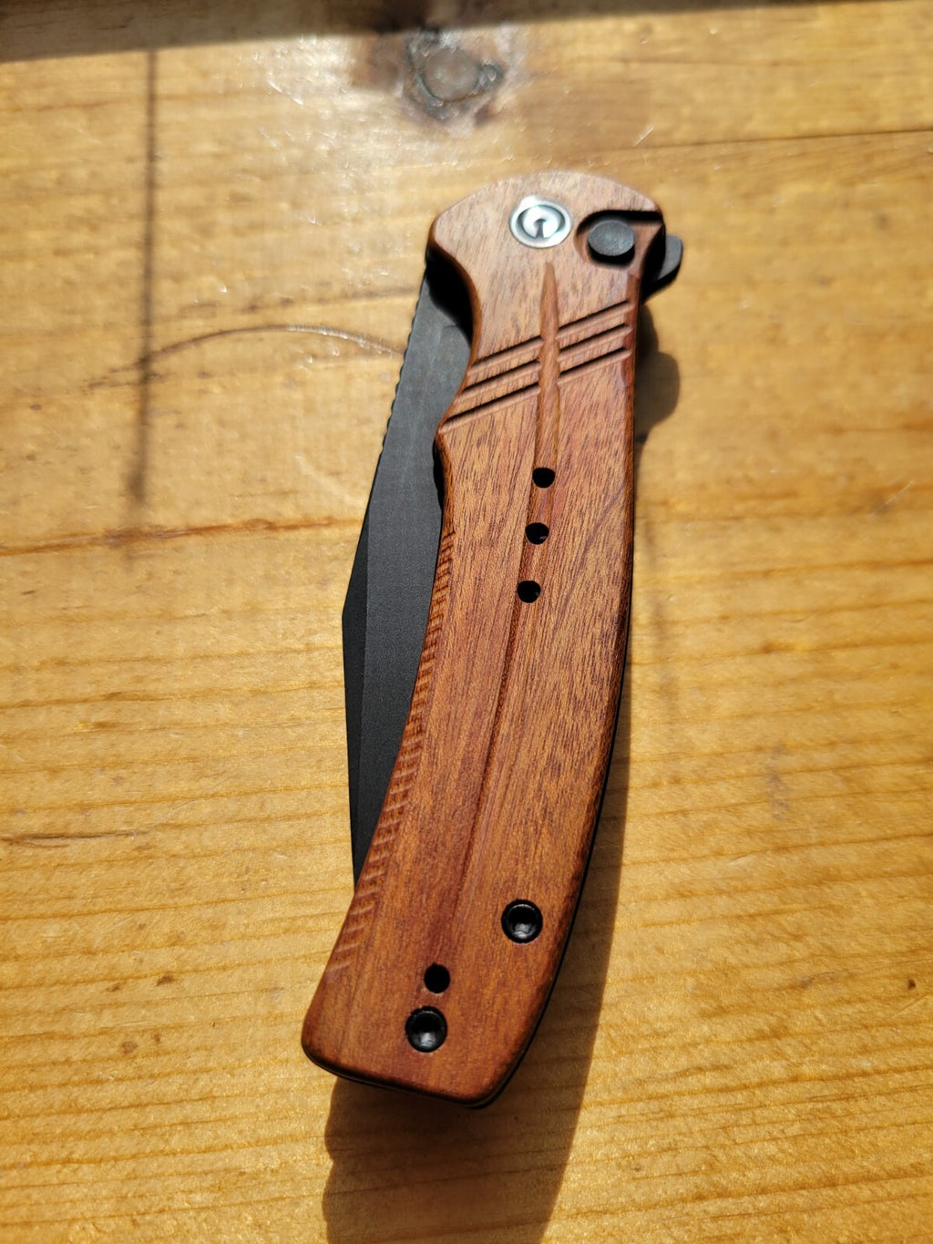 Blade Material: 14C28N Blade Hardness: 57-59HRC Blade Grind: Flat Blade Finish: Black Stonewashed Blade Type: Clip Point Handle Material: Guibourtia Wood Handle Color/Finish: Wood Liner Material: Stainless Steel Liner Color/Finish: Black Pocket Clip: Tip-Up, L/R Clip Material: Stainless Steel Screws Material: Stainless Steel Pivot Assembly: Caged Ceramic Ball Bearing Locking Mechanism: Button Lock