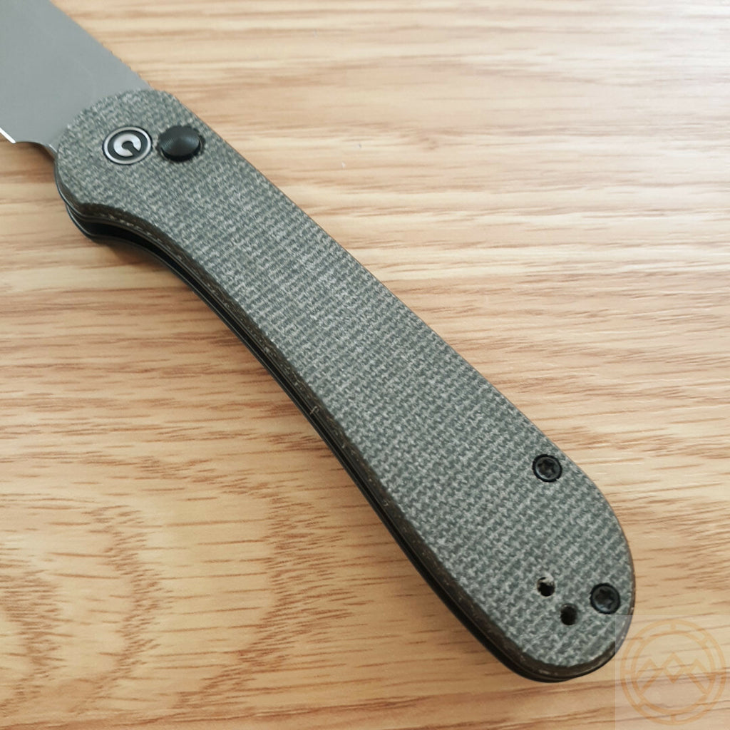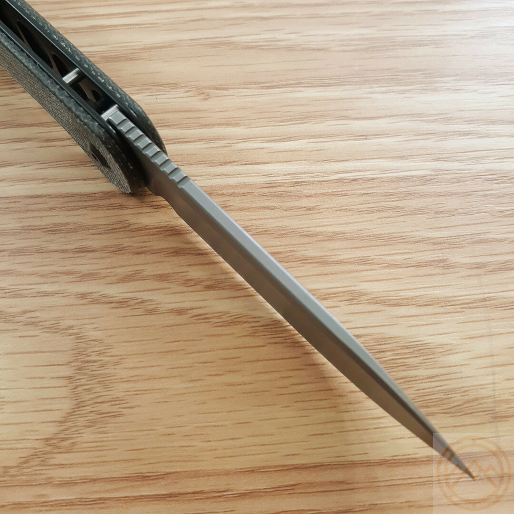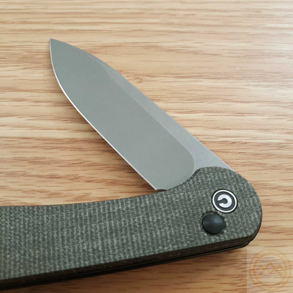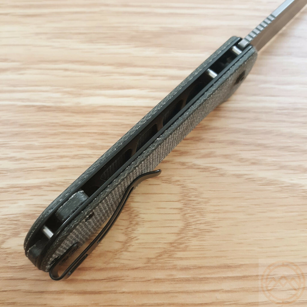 4.5" (11.43cm) closed. 3.5" (8.89cm) stonewash finish 14C28N Sandvik stainless blade. Green canvas micarta handle. Pocket clip. Boxed.