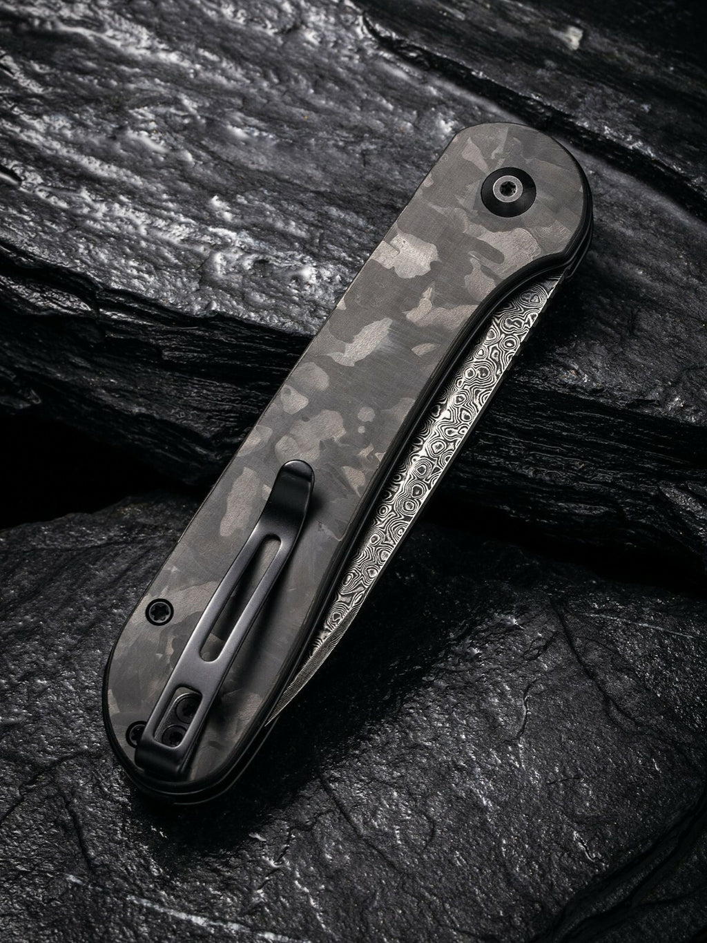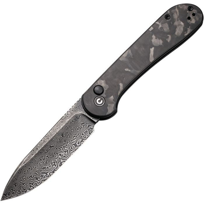 4.5" (11.43cm) closed. 3.5" (8.89cm) Damascus steel blade. Marbled carbon fiber handle. Pocket clip. Boxed.