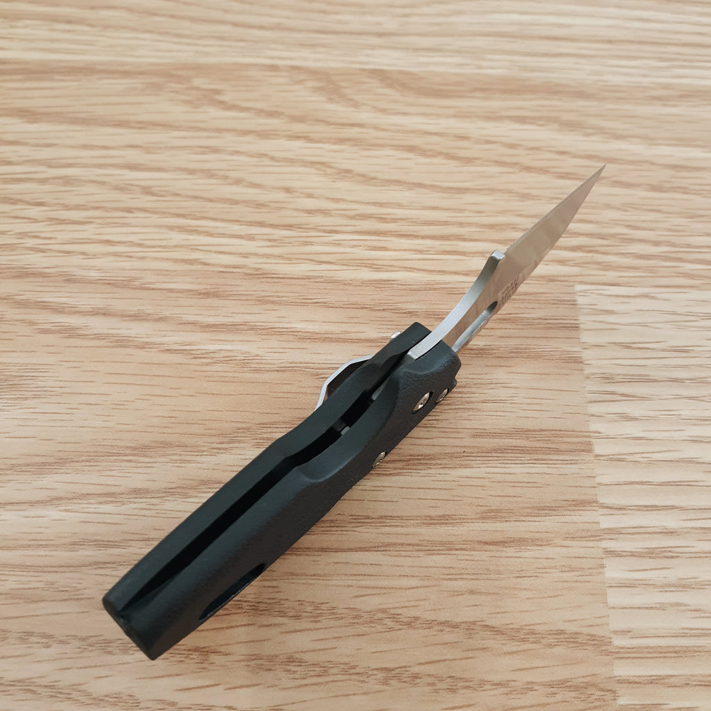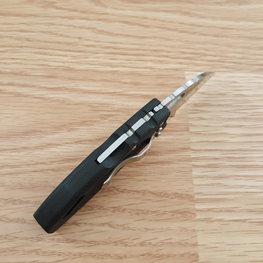 3" (7.62cm) closed. 2" (5.08cm) satin finish 4034 stainless blade. Black Griv-Ex handle. Thumb pull. Lanyard hole. Pocket clip Boxed.