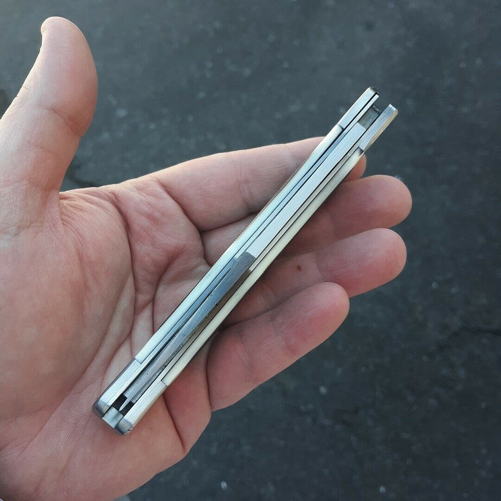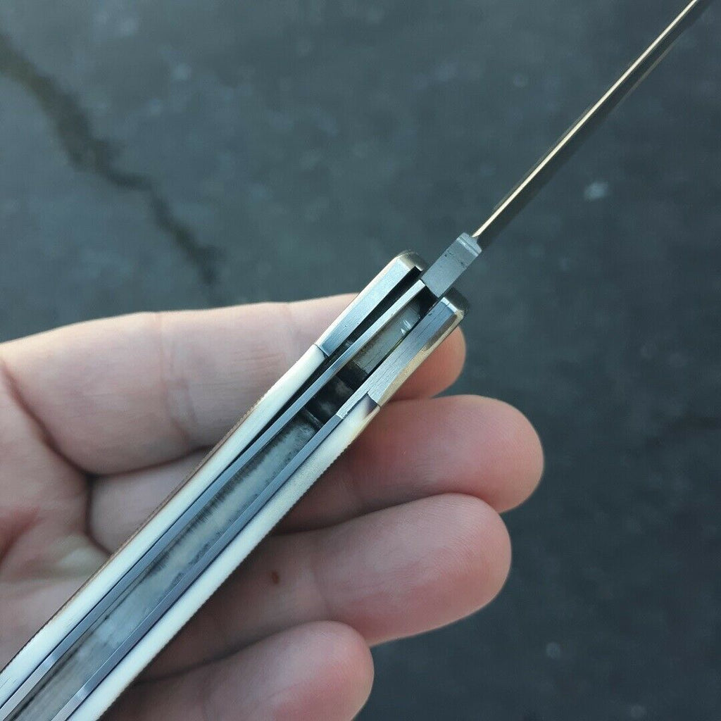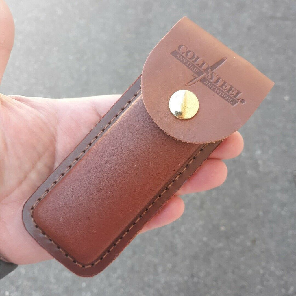 5.25" (13.34cm) closed. 4" (10.16cm) satin finish SK5 carbon steel clip blade. Faux sawcut bone handle. Stainless bolster(s). Inlay shield. Lanyard hole. Brown leather belt sheath. Boxed