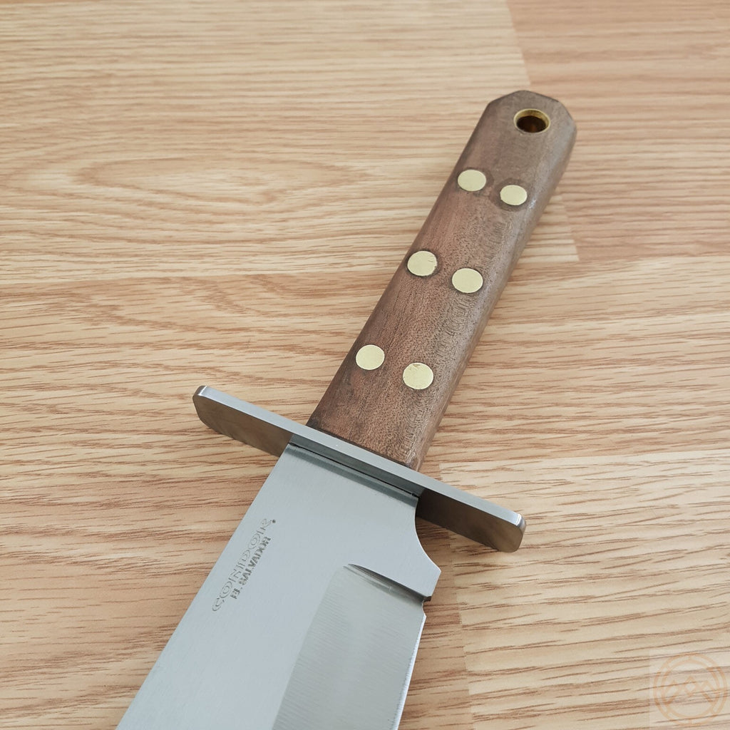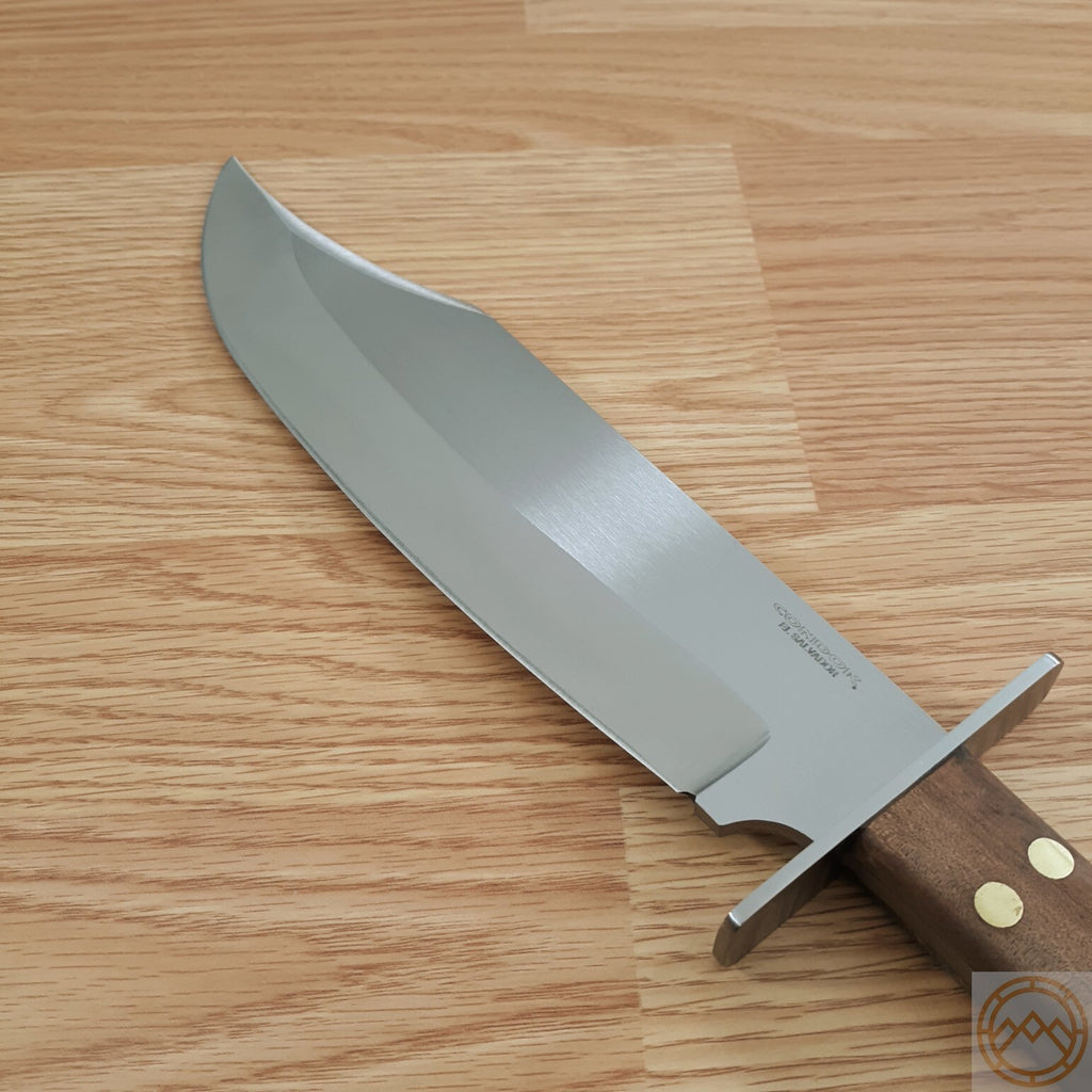 15.5" overall. 10" satin finish 1075HC steel clip point blade. Brown Walnut handle. Stainless guard. Full tang. Lanyard hole. Brown leather belt sheath.