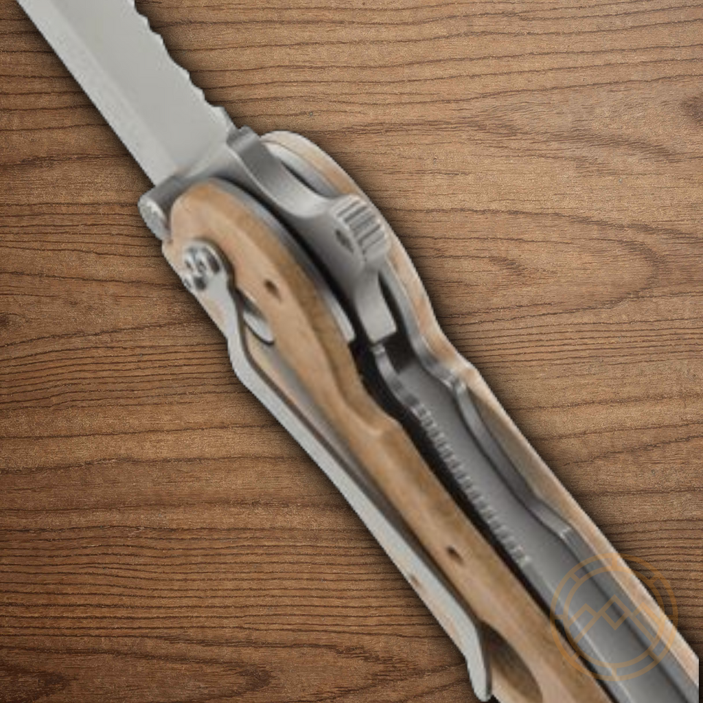 5.375" closed. 4" bead blast finish partially serrated AUS-8 stainless Tanto blade. Camo GRN handle. Thumb stud. Extended tang. Pocket clip. Boxed.