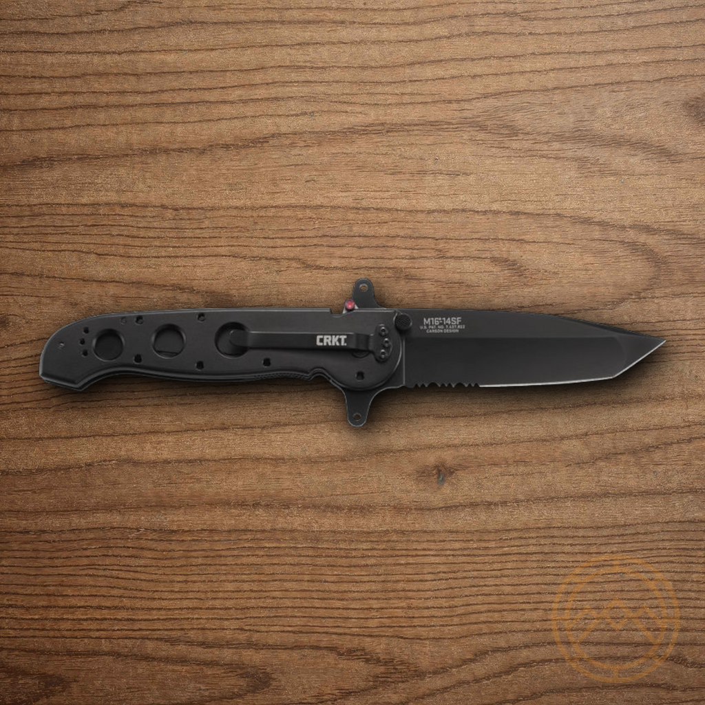 5.25" closed. 4" black TiNi coated partially serrated stainless tanto blade. Black aluminum handle. Thumb stud. Extended tang. Pocket clip. AutoLAWKS safety. Boxed.