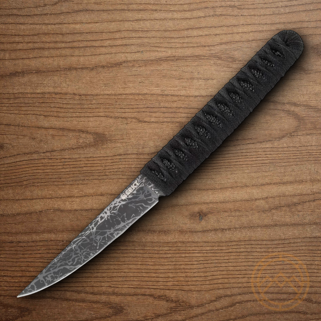 Features: Black faux ray skin handle with black paracord wrap - Black cord lanyard