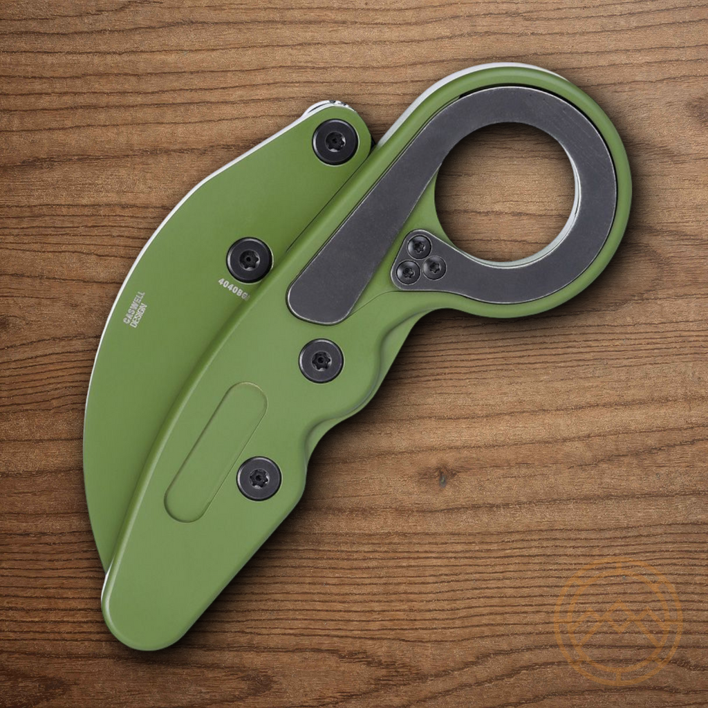 5" (12.7cm) closed. 2.38" (6.05cm) green Cerakote finish D2 tool steel blade. Black aluminum handle. Finger ring. Kinematic innovation deploys the blade quickly for first responders. Designed by Joe Caswell. Boxed.