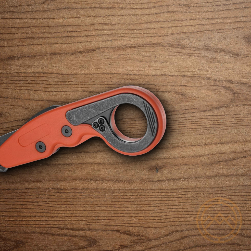 5" (12.7cm) closed. 2.5" (6.35cm) black stonewash finish 1.4116 stainless blade. Orange Grivory handle. Finger ring. Boxed.