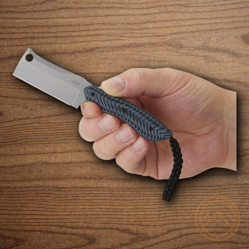 5.63" (14.3cm) overall. 2.5" (6.35cm) bead blast finish 8Cr13MoV stainless cleaver style blade. Black and blue textured G10 handle. Full tang. Lanyard hole. Small. Pocket. Everyday. Cleaver. Braided paracord lanyard. Black thermoplastic belt sheath. Designed by Alan Folts. Boxed.