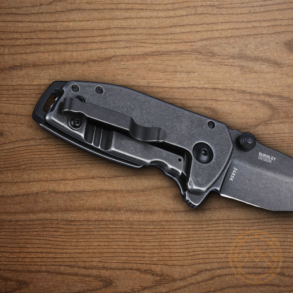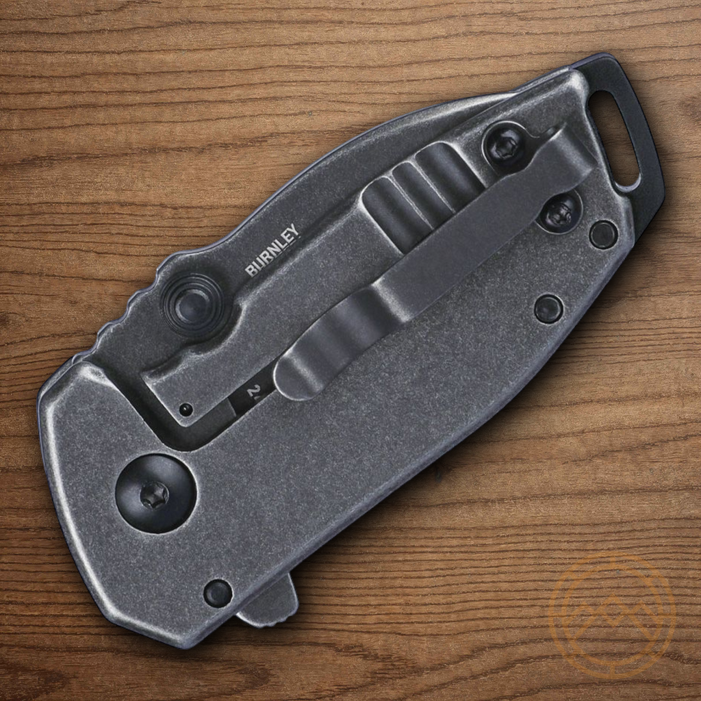 Assisted opening. 3" (7.62cm) closed. 1.75" (4.45cm) black stonewash finish 8Cr13MoV stainless blade. Black stonewash finish stainless handle. Extended tang. Lanyard hole. Pocket clip. Thumb stud. Designed by Lucas Burnley. Boxed.