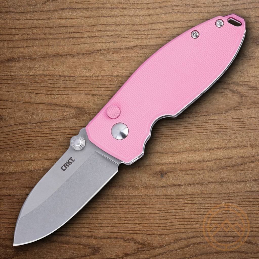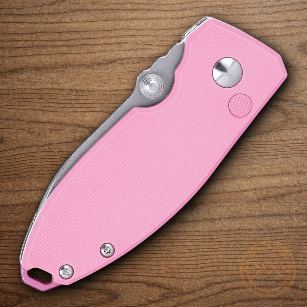 3.25" (8.26cm) closed. 2.25" (5.72cm) stonewash finish 14C28N Sandvik stainless blade. Rose G10 handle. Thumb stud. Lanyard hole. Pocket clip. Boxed.