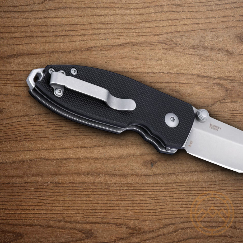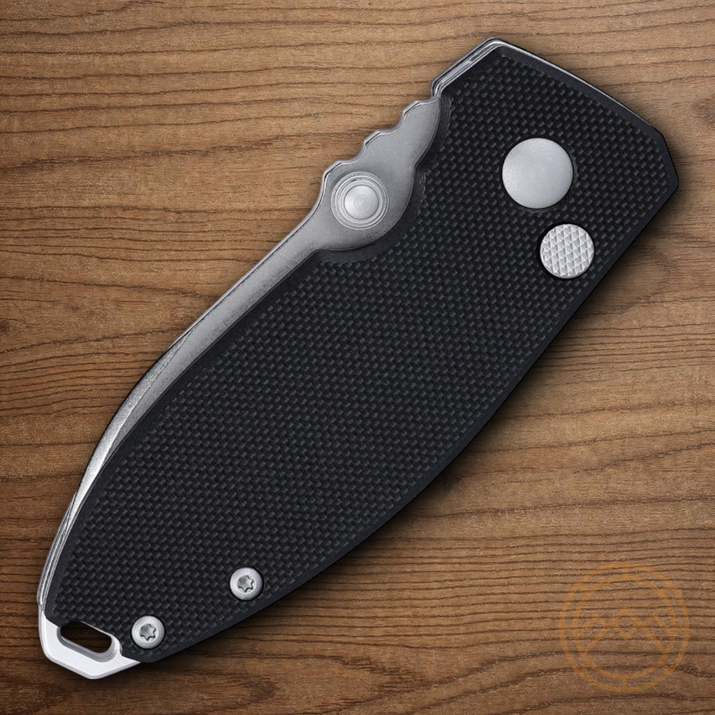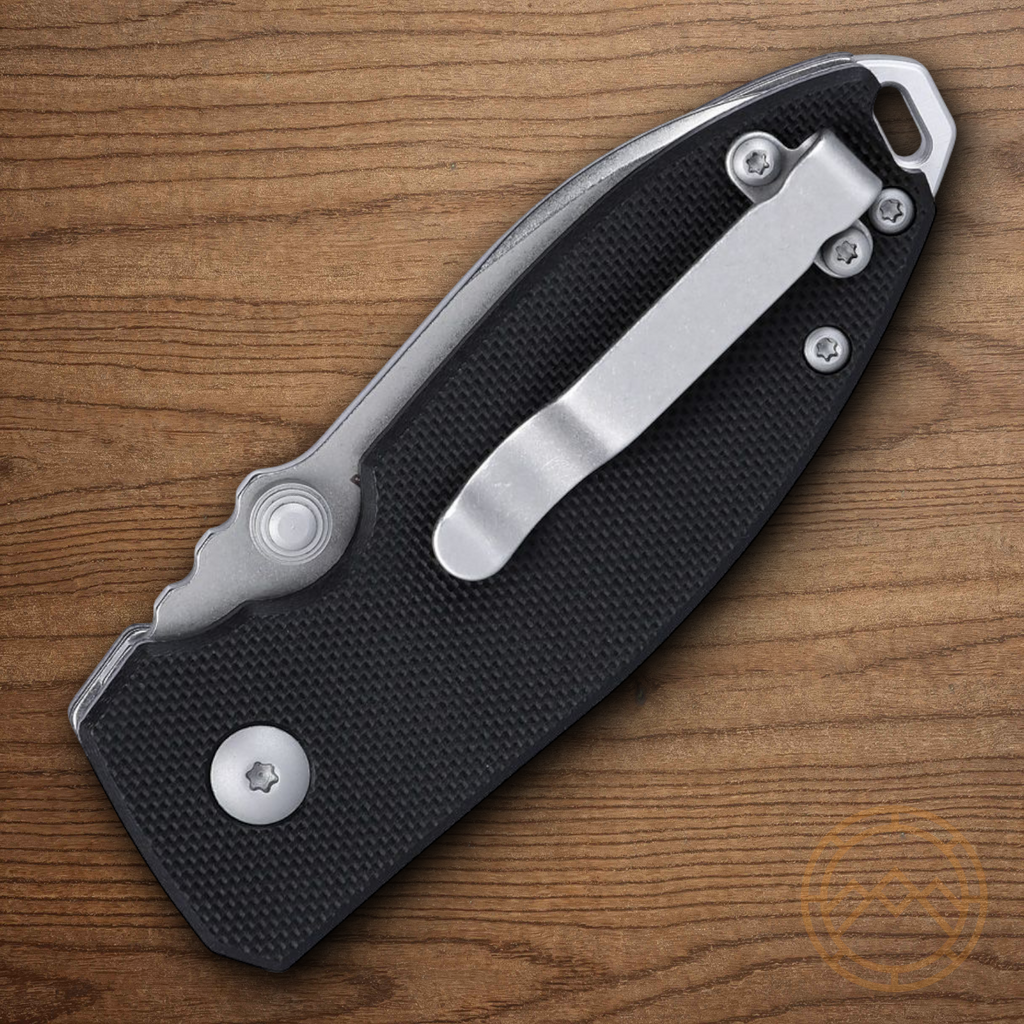 3.25" (8.26cm) closed. 2.25" (5.72cm) stonewash finish D2 tool steel blade. Black G10 handle. Thumb stud. Lanyard hole. Pocket clip. Boxed.