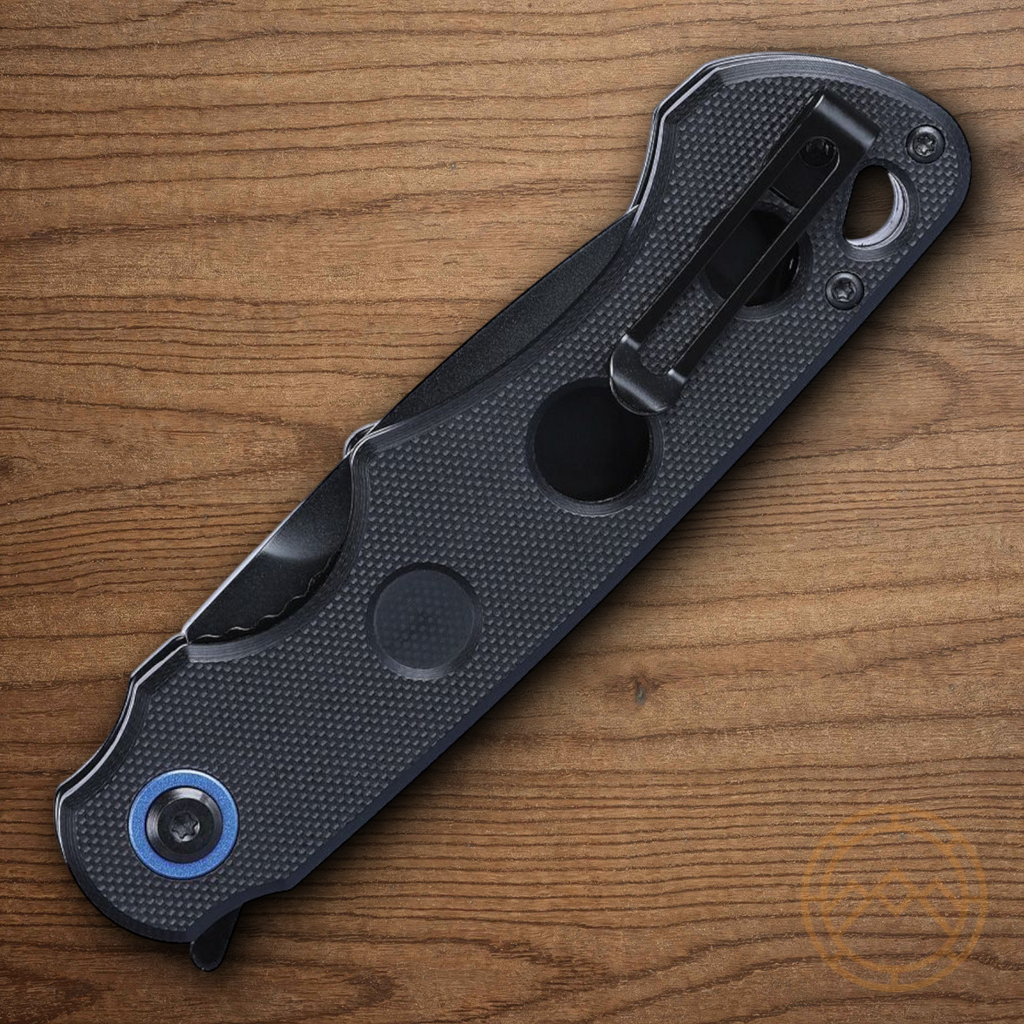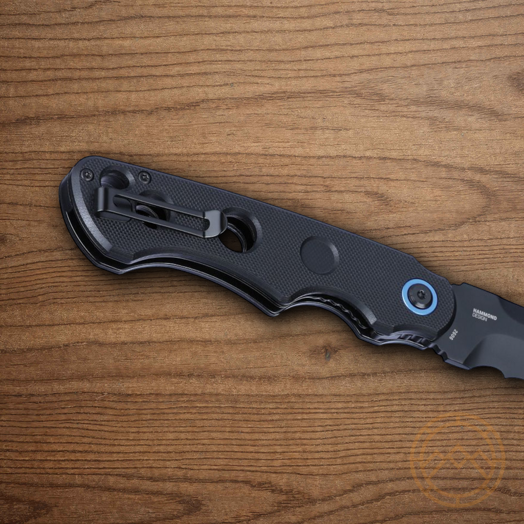Assisted opening. 4.63" (11.76cm) closed. 3.38" (8.59cm) black oxide coated Veff serrated 12C27 Sandvik stainless tanto blade. Black G10 handle. Extended tang. Lanyard hole. Pocket clip. Designed by Jim Hammond. Boxed.