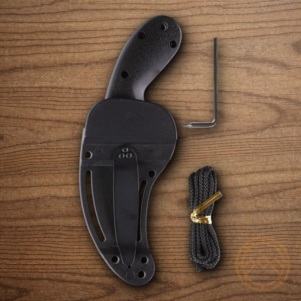 Features: Finger ring - Full tang - Lanyard hole - Black sheath. Thermoplastic neck sheath