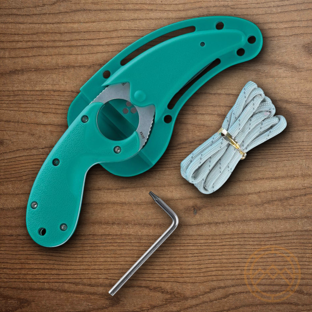 Features: Finger ring - Full tang - Lanyard hole - Teal sheath. Thermoplastic neck sheath