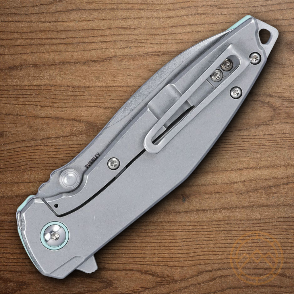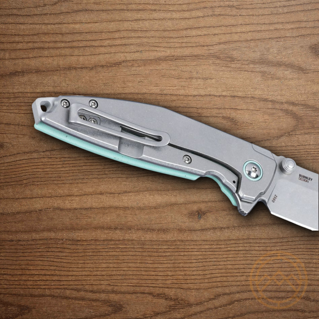 4.13" (10.49cm) closed. 3.13" (7.95cm) stonewash finish 14C28N Sandvik stainless blade. Tiffany blue G10 handle with stonewash finish stainless back handle. Extended tang. Thumb stud. Lanyard hole. Pocket clip. Boxed.