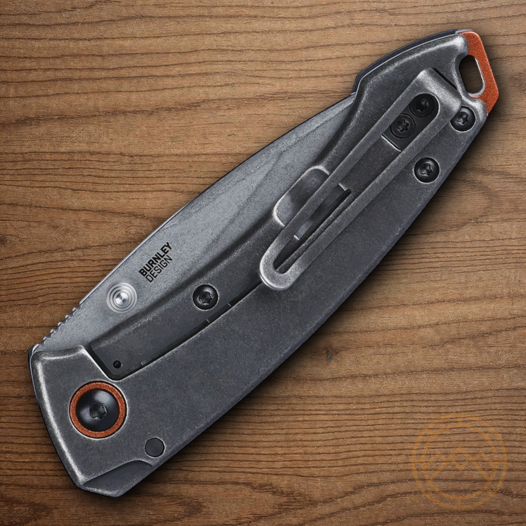 3.88" (9.86cm) closed. 2.75" (6.99cm) stonewash finish 8Cr13MoV stainless blade. Black G10 handle with Black stonewash stainless back handle. Thumb stud. Lanyard hole. Pocket clip. Orange accents. Designed by Lucas Burnley. Boxed.