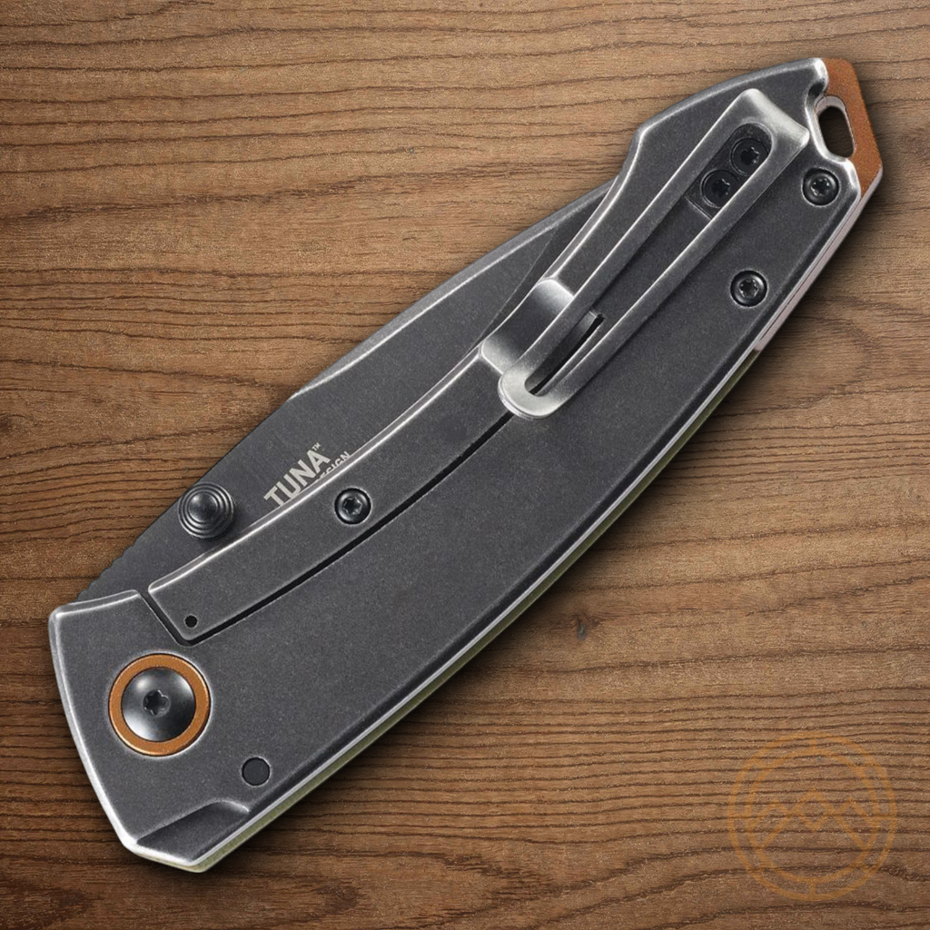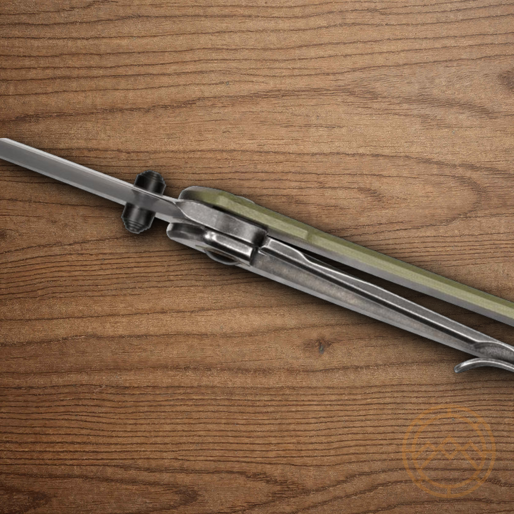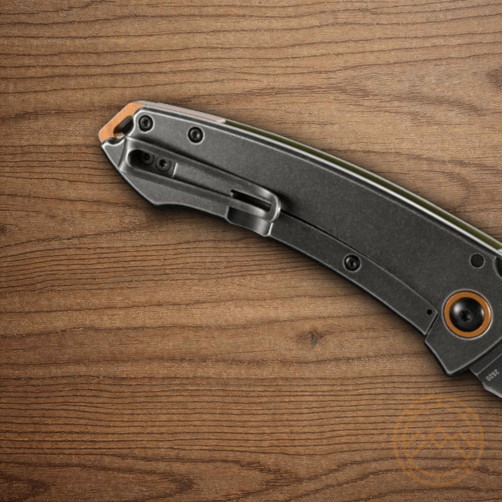 4.5" (11.43cm) closed. 3.25" (8.26cm) black stonewash finish 8Cr14MoV stainless blade. Green G10 handle with black stonewash stainless back handle. Thumb stud. Lanyard hole. Pocket clip. Designed by Lucas Burnley. Boxed.