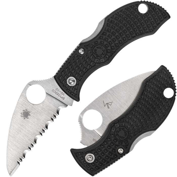 2.5" (6.35cm) closed. 2" (5.08cm) satin finish serrated VG-10 stainless blade. Black bi-directional texture FRN handle. Thumb pull. Lanyard hole. Pocket clip. Boxed.