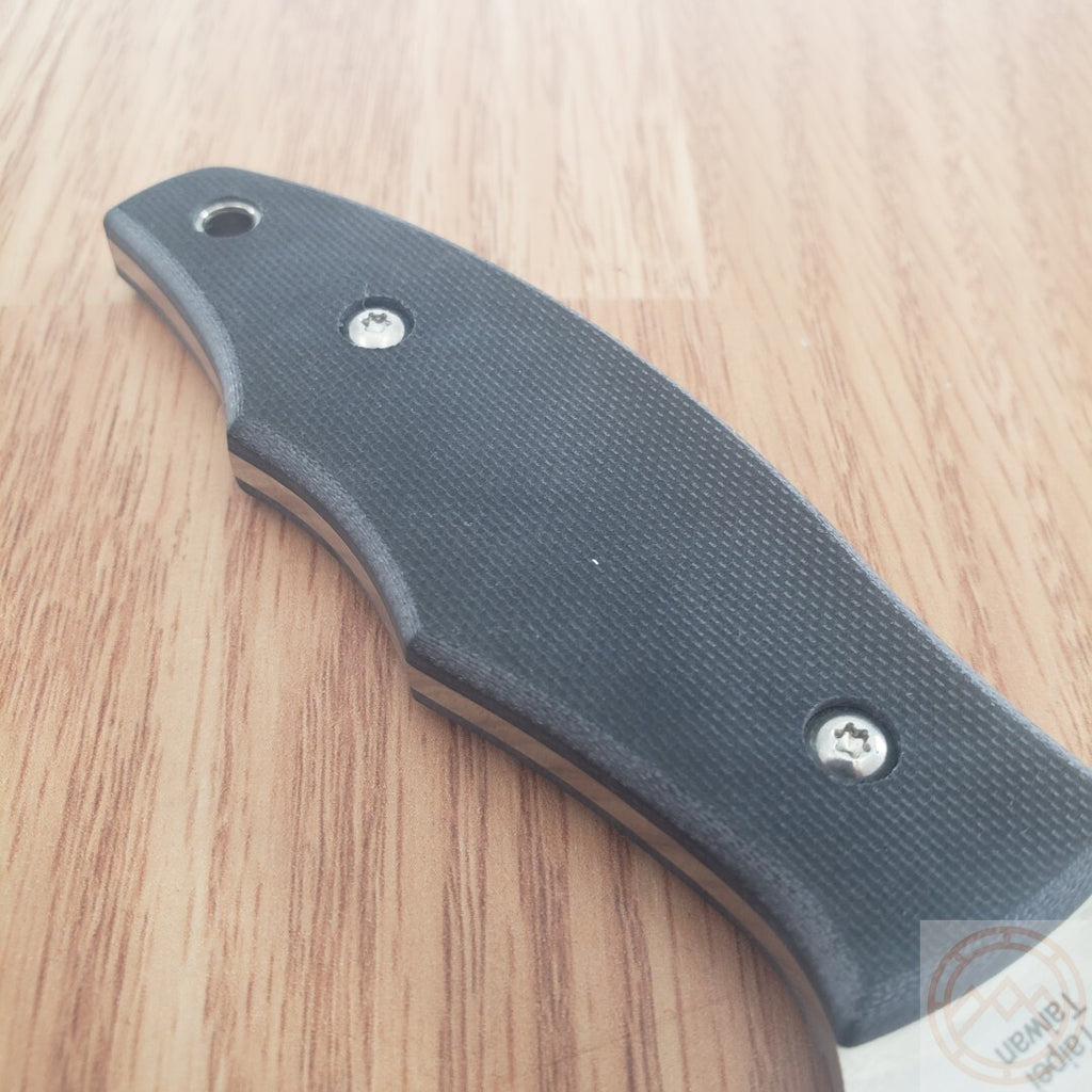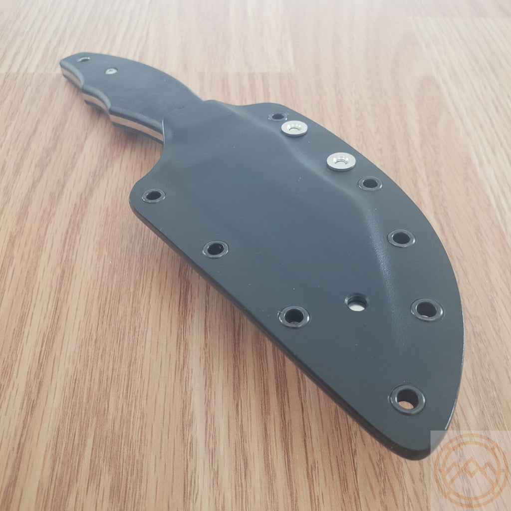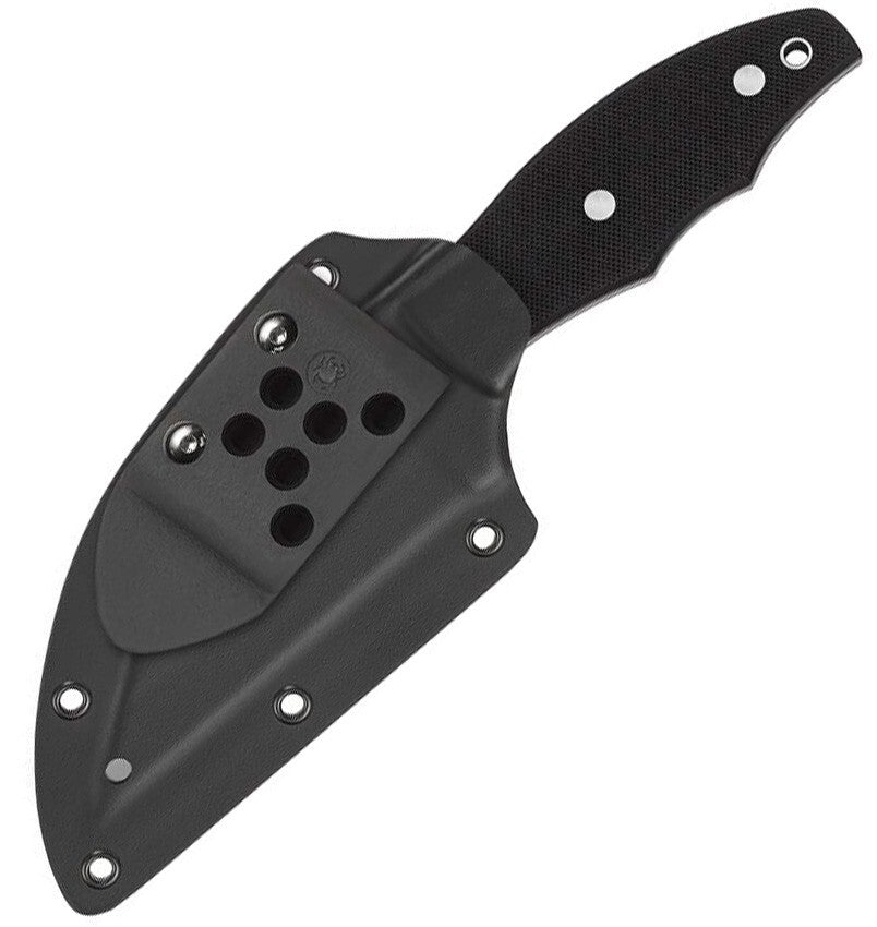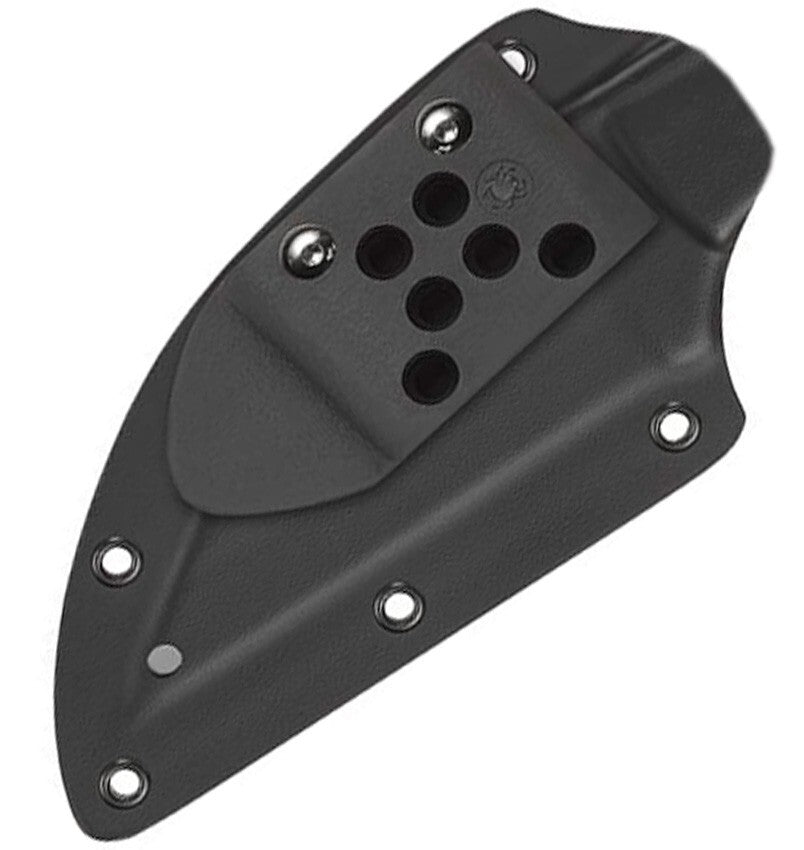 7.88" overall. 4.13" satin finish CTS-BD1 stainless Wharncliffe blade. Black G10 handle. Thumb pull. Full tang. Pocket clip. Custom molded Boltaron sheath with G-clip attachment. Boxed.