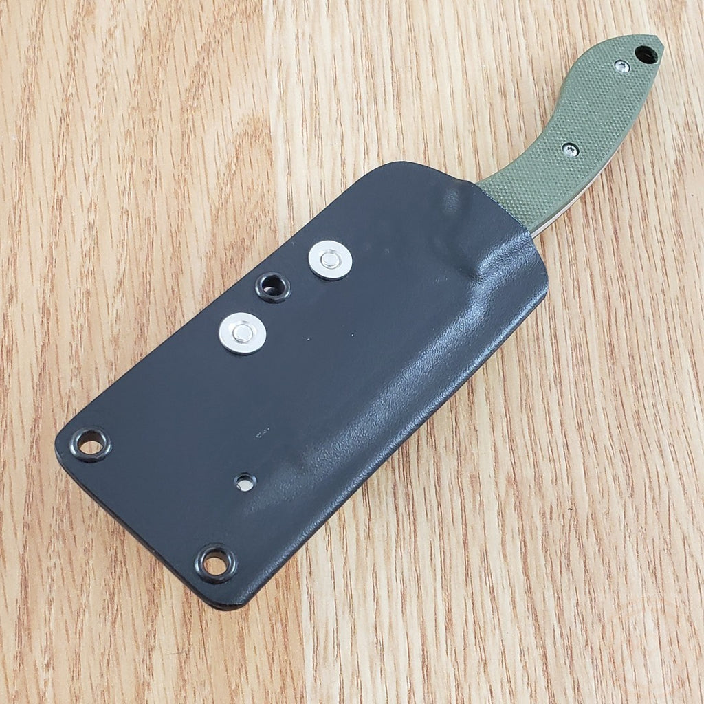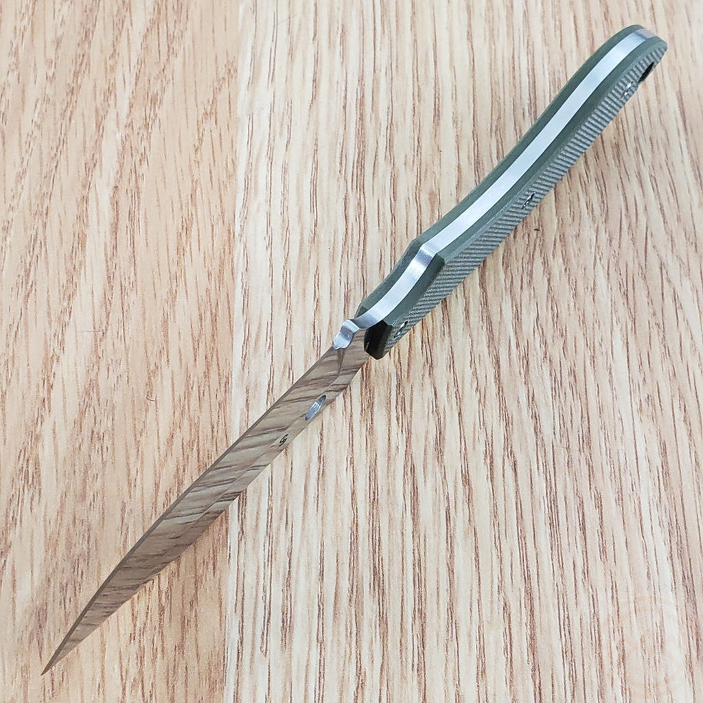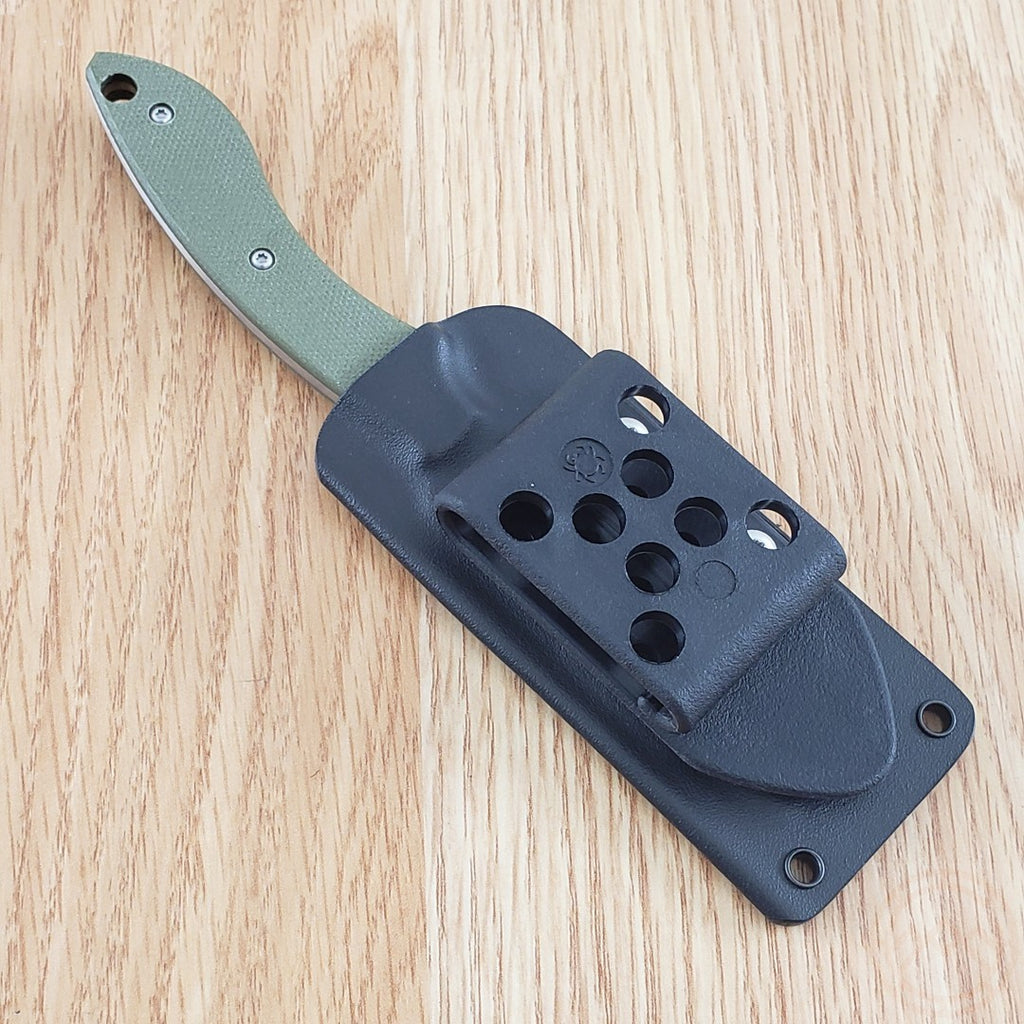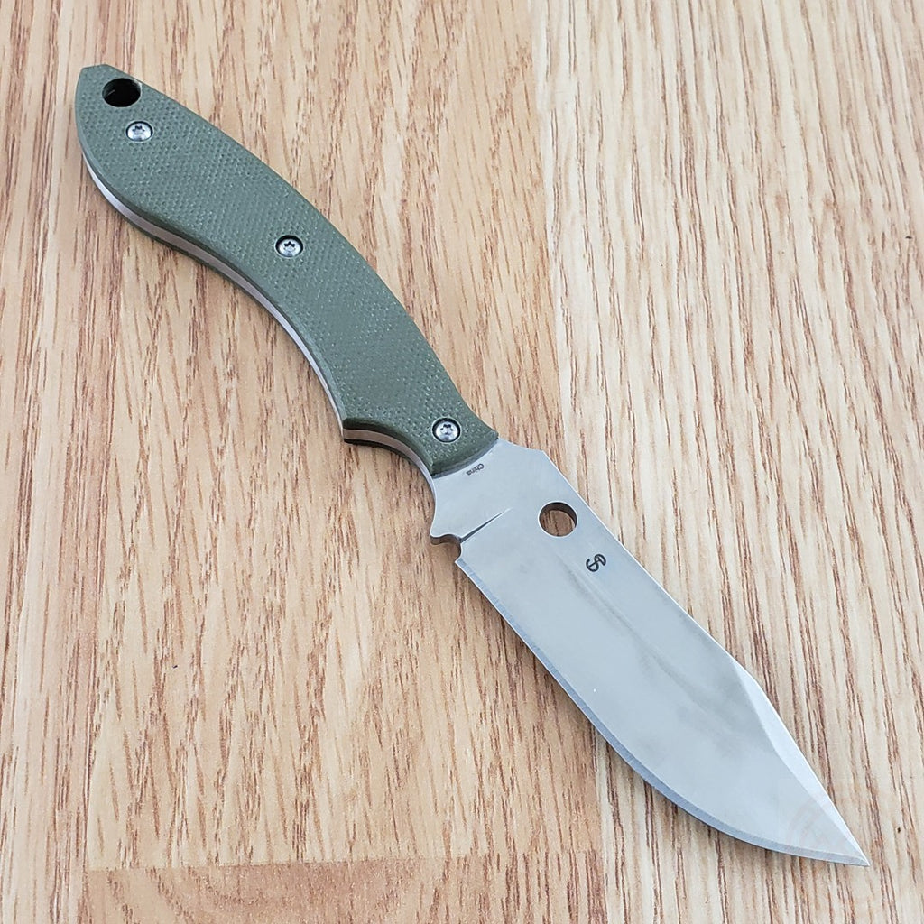 6.5" (16.51cm) overall. 3" (7.62cm) satin finish 8Cr13MoV stainless blade. OD green G10 handle. Full tang. Lanyard hole. Saber grind blade. Black Boltaron belt sheath. Boxed.