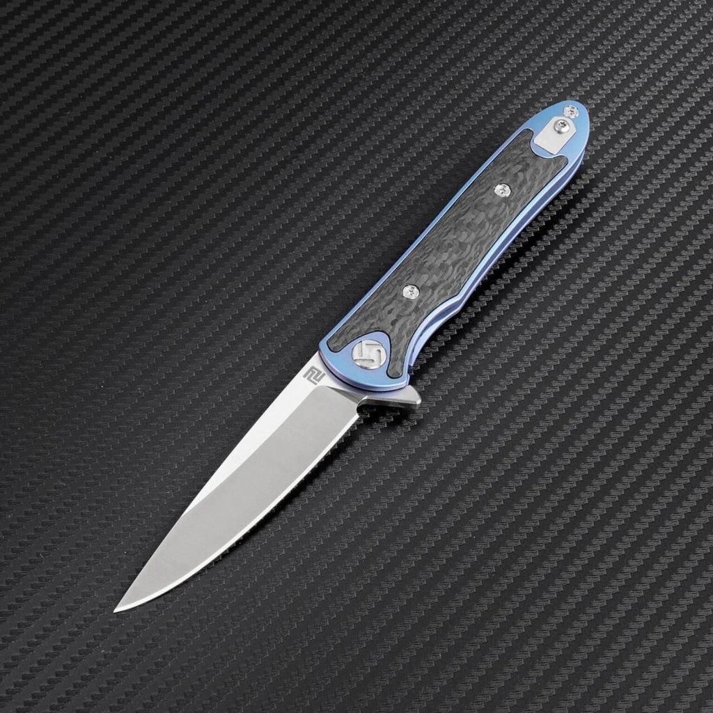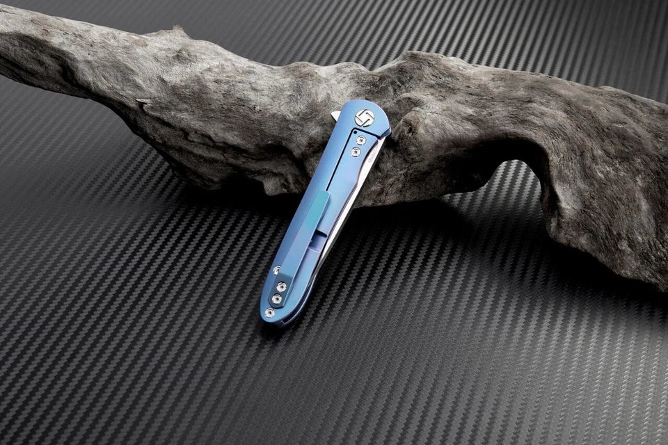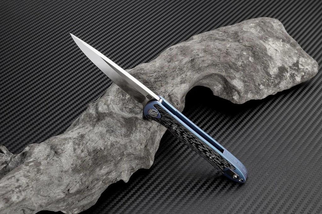 4" closed. 3" stonewash finish S35VN stainless blade. Blue anodized titanium handle with carbon fiber inlay. Extended tang. Pocket clip. Boxed.