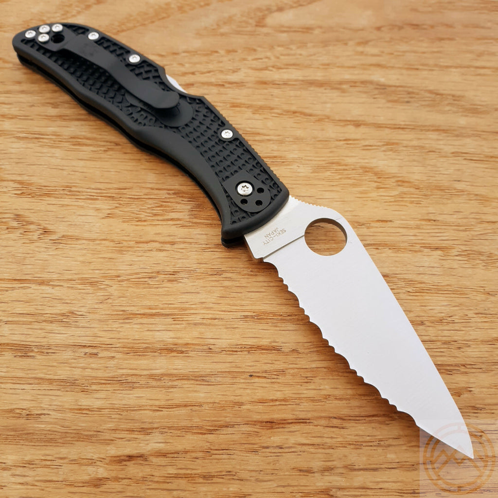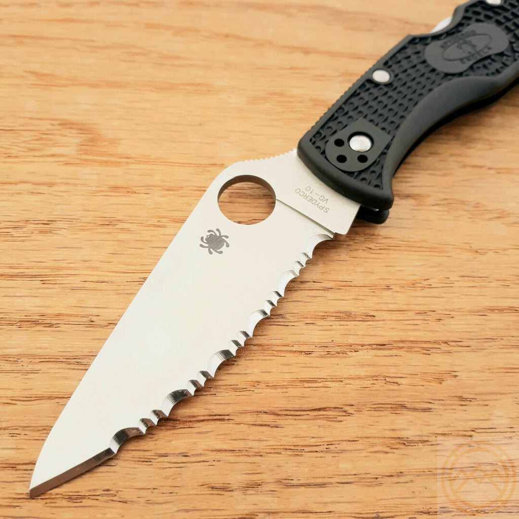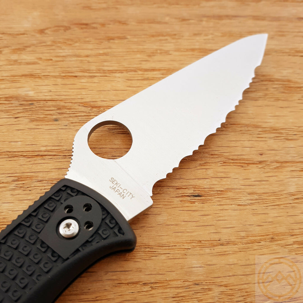 4.75" closed. 3.5" satin finish serrated VG-10 stainless blade. Black bi-directional texture FRN handle. Thumb pull. Pocket clip. Lanyard Hole. Boxed.