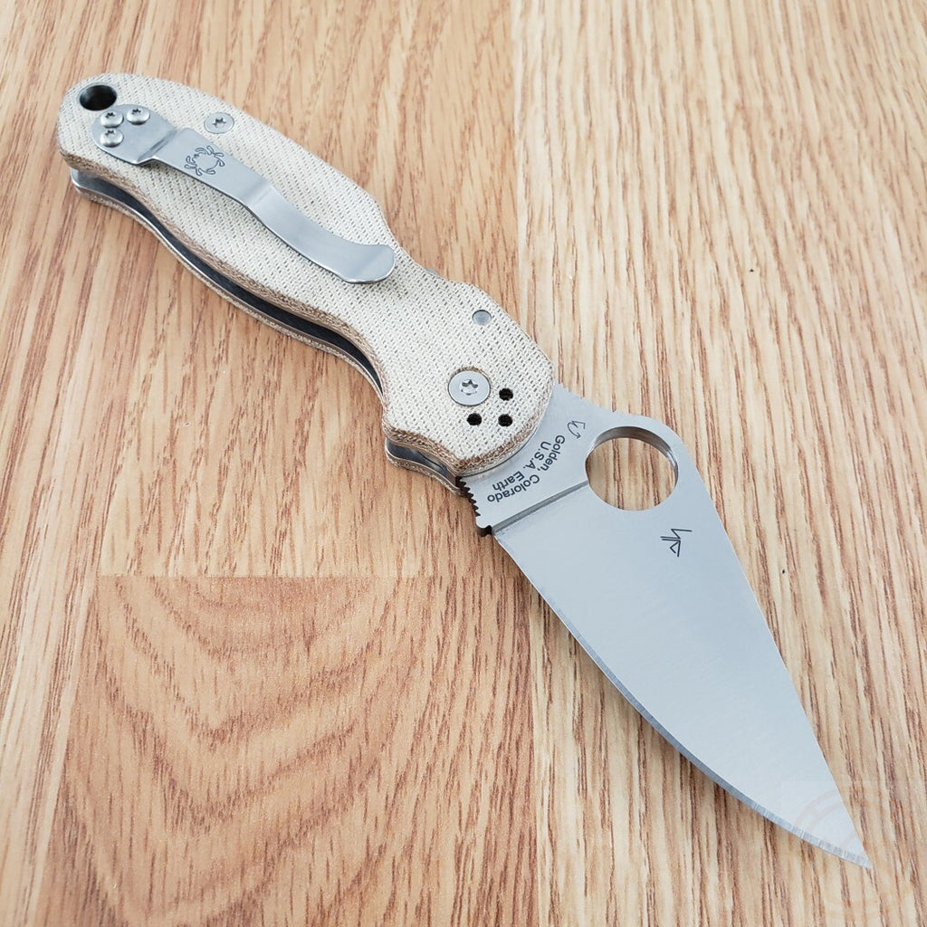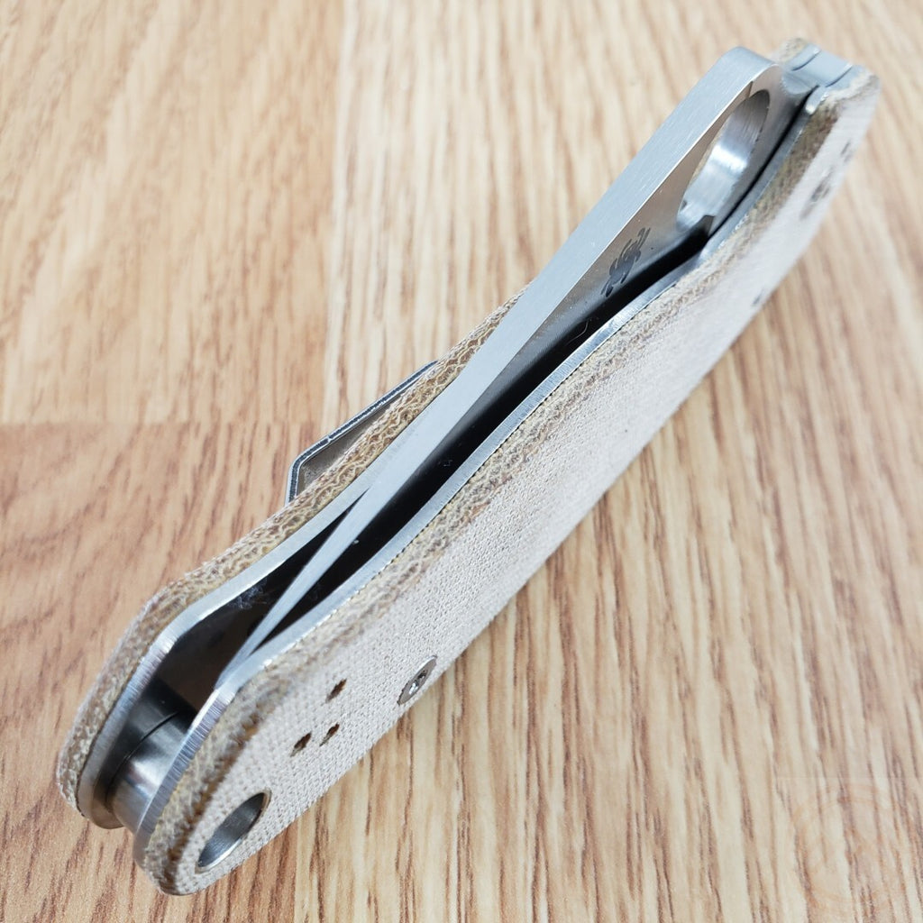 4.25" (10.8cm) closed. 3" (7.62cm) satin finish CPM Cru-Wear steel blade. Brown micarta handle. Thumb pull. Pocket clip. Boxed.