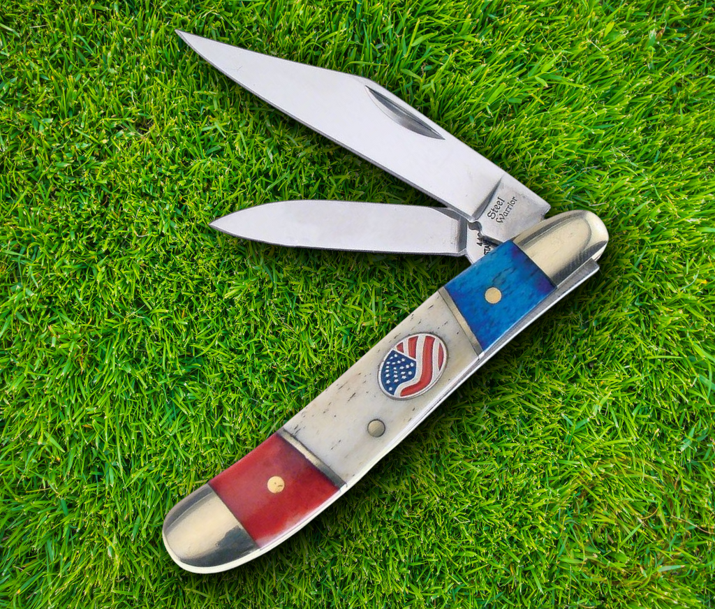 2.75" closed. Mirror finish stainless clip and pen blades. Smooth bone handle. Red, white, and blue handle. Boxed.