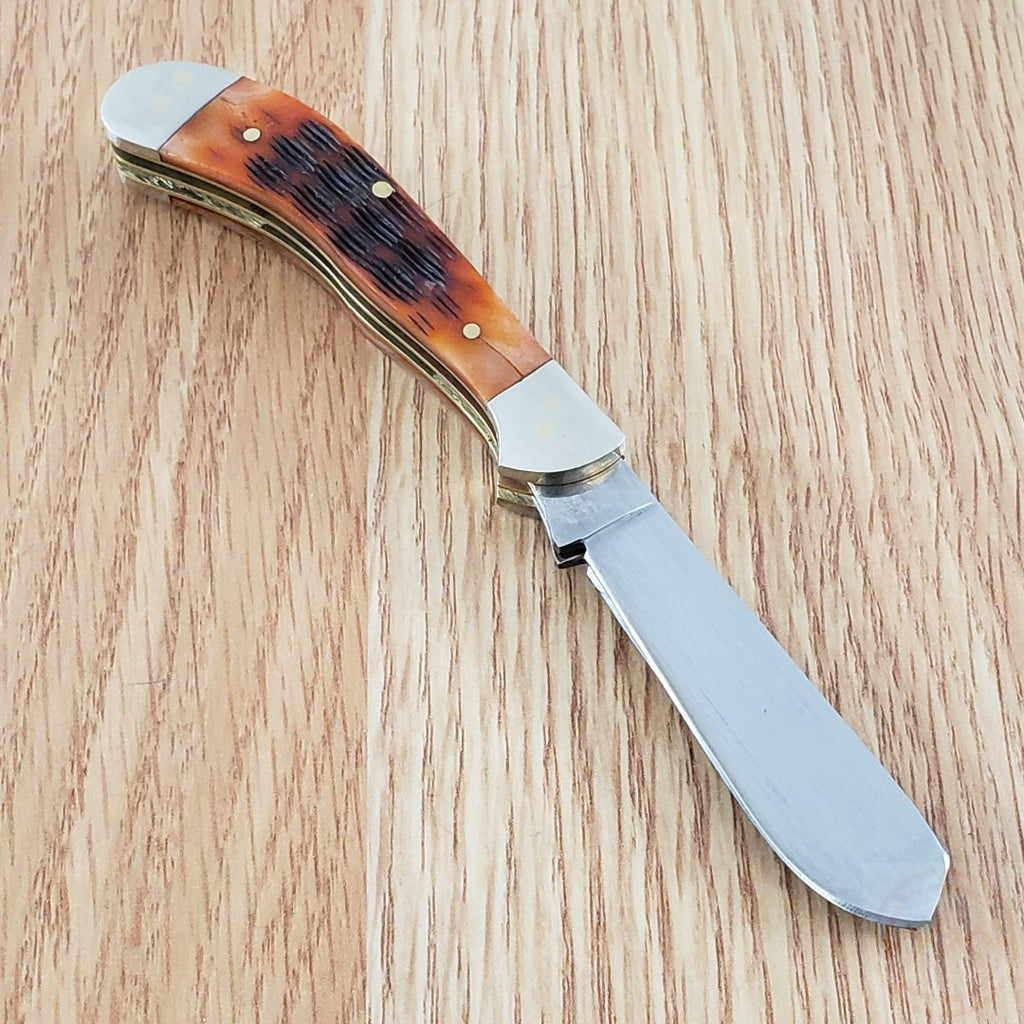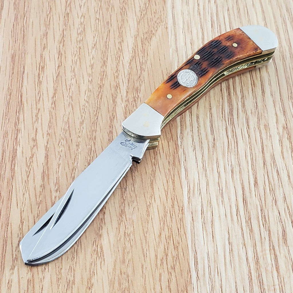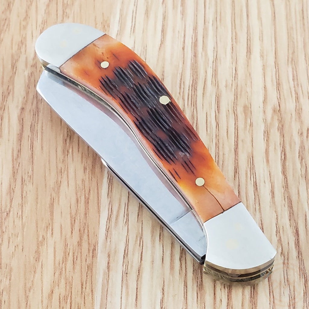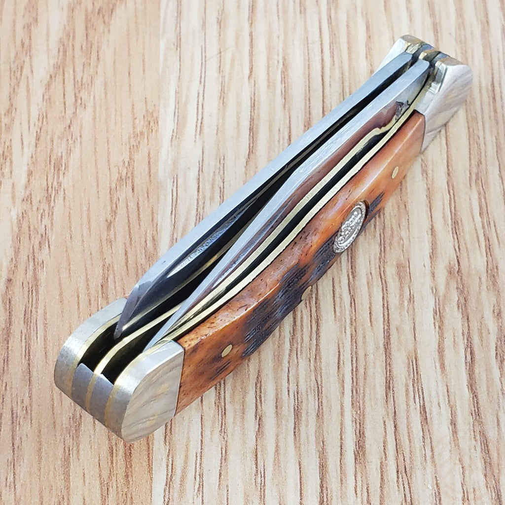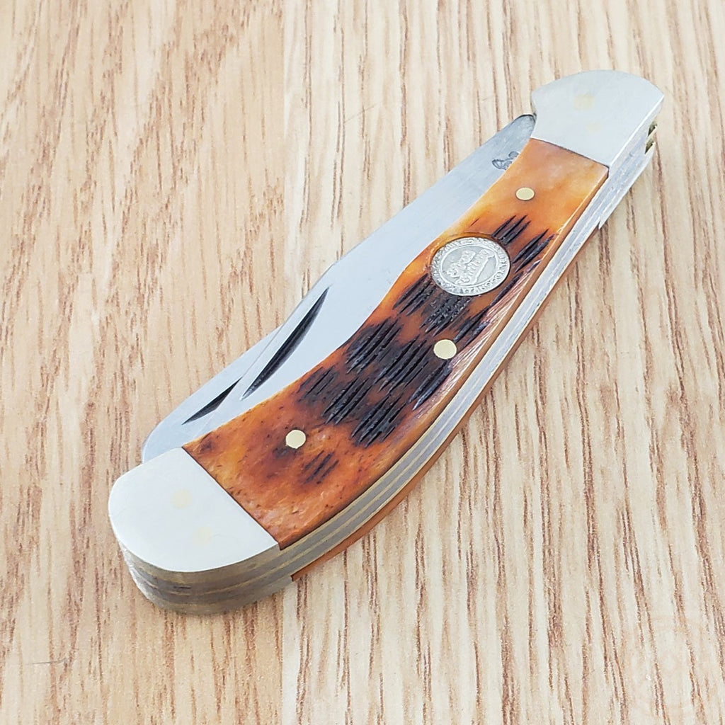 3.25" (8.26cm) closed. Mirror finish stainless clip and skinner blades. Tennessee peach seed bone handle. Nickel silver bolster(s). Inlay shield. Boxed.