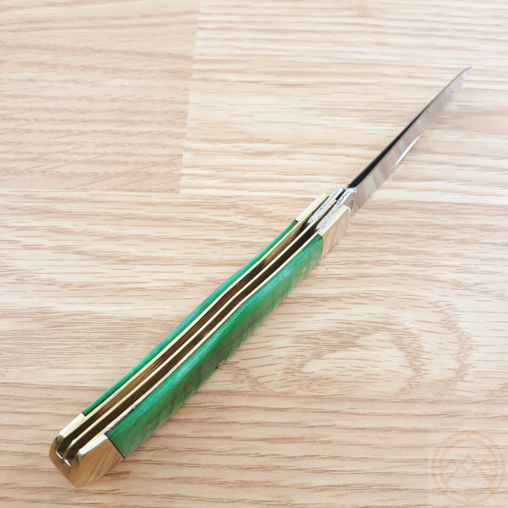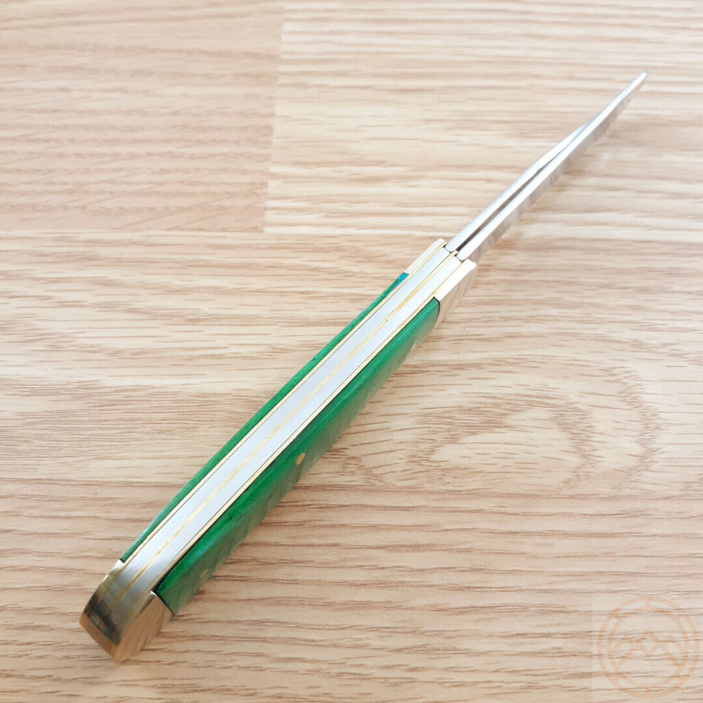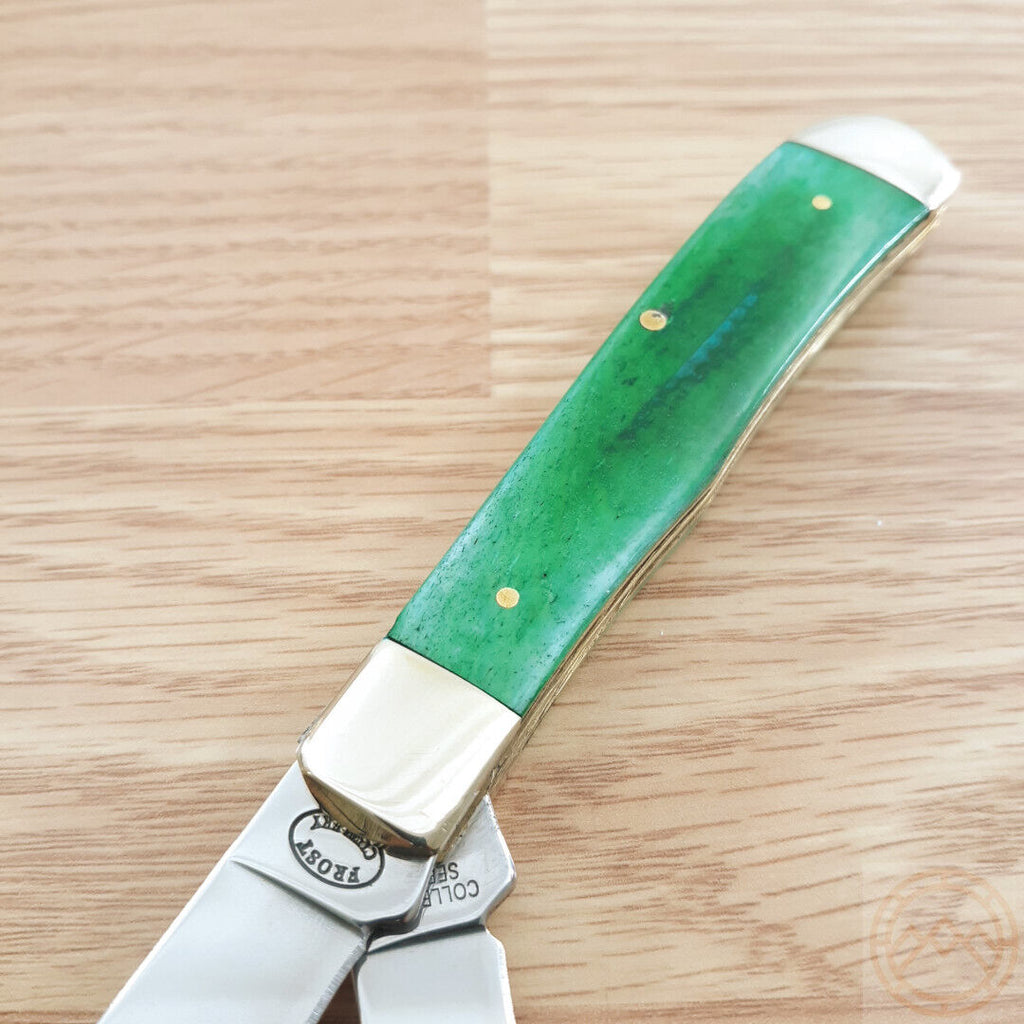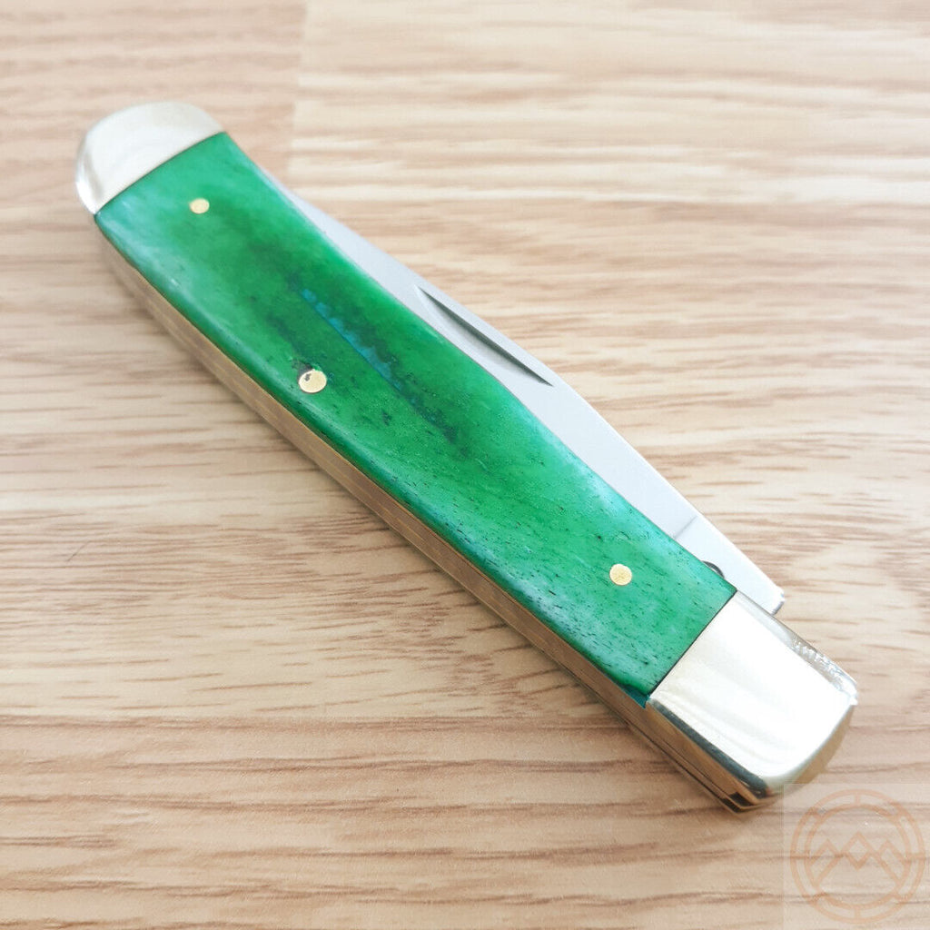 4.25" (10.8cm) closed. Mirror finish stainless clip and spey blades. Green smooth bone handle. Nickel silver bolster(s). Boxed.
